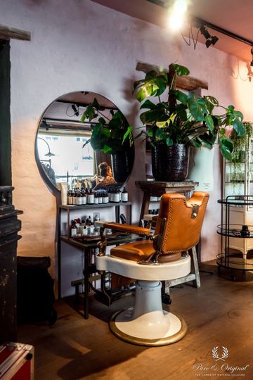 De roze muur bij het kappersgedeelte is geschilderd met Fresco kalkverf in de kleur Old Rose