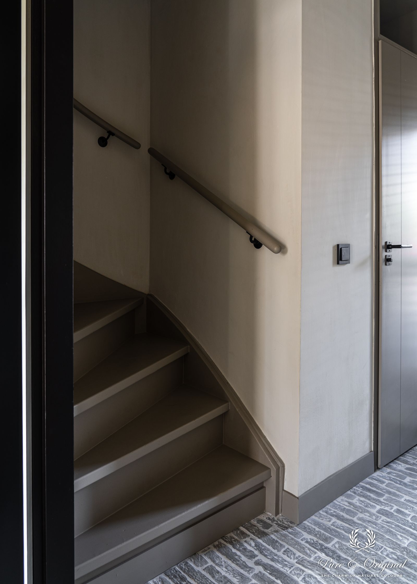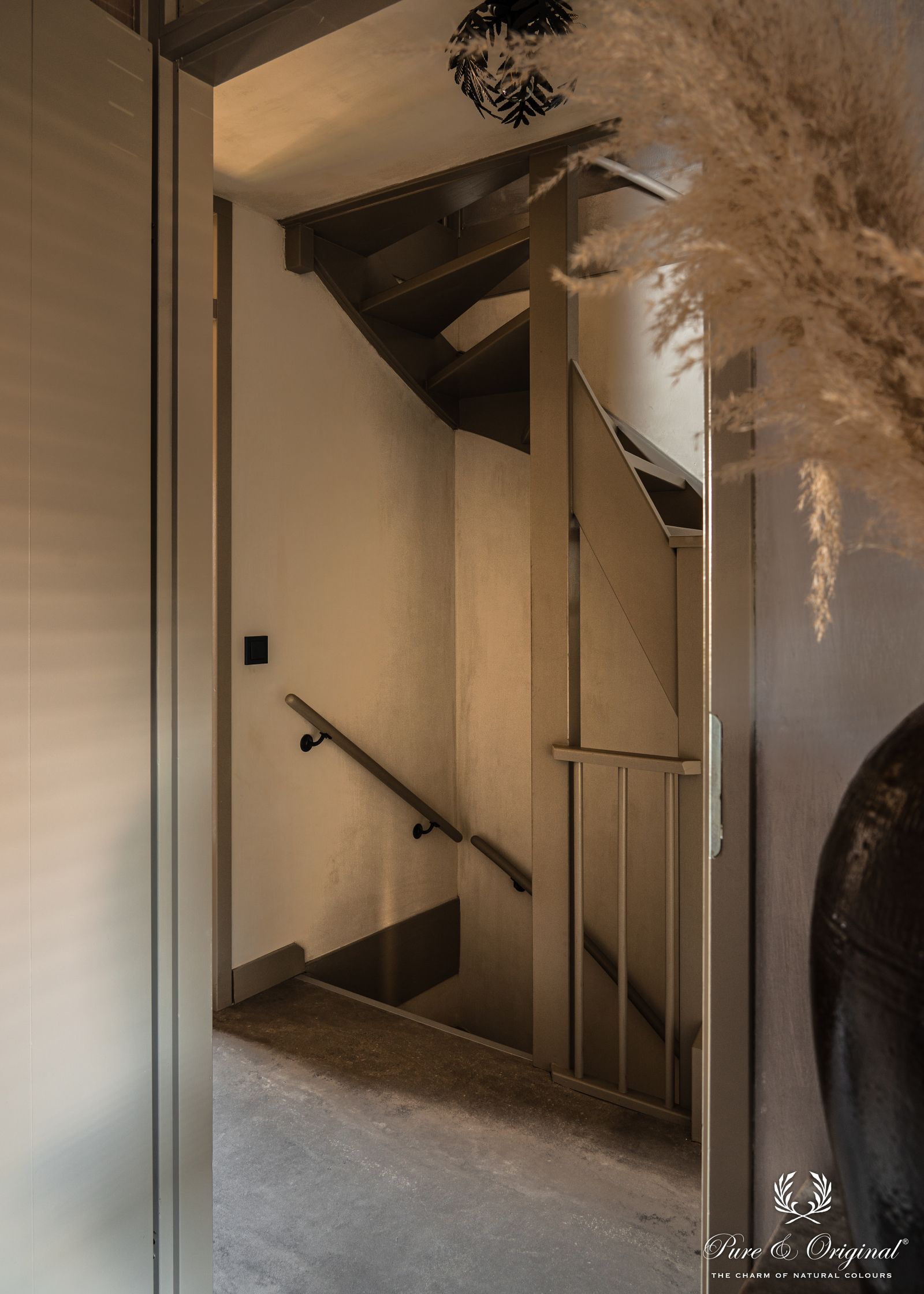 De gangmuur is geschilderd met Fresco kalkverf in de kleur Wild Garlic en de trap is geschilderd met Carazzo universele lakverf in de kleur Dried Clay