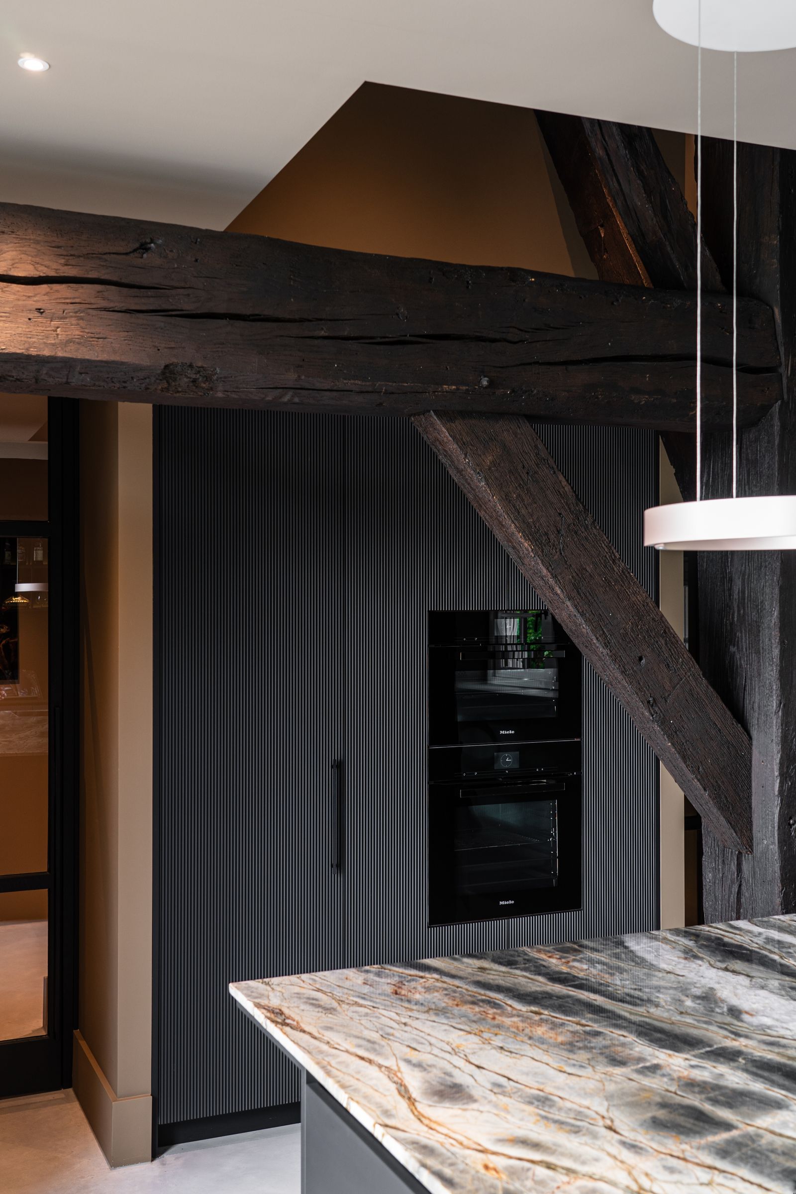 Vanuit de entree kom je binnen in de woonkeuken die geschilderd is met Licetto in de kleuren Black Hills, Mexican Sand en Latte Macchiato. Het plafond is geschilderd met Classico krijtverf in de kleur Silk White.