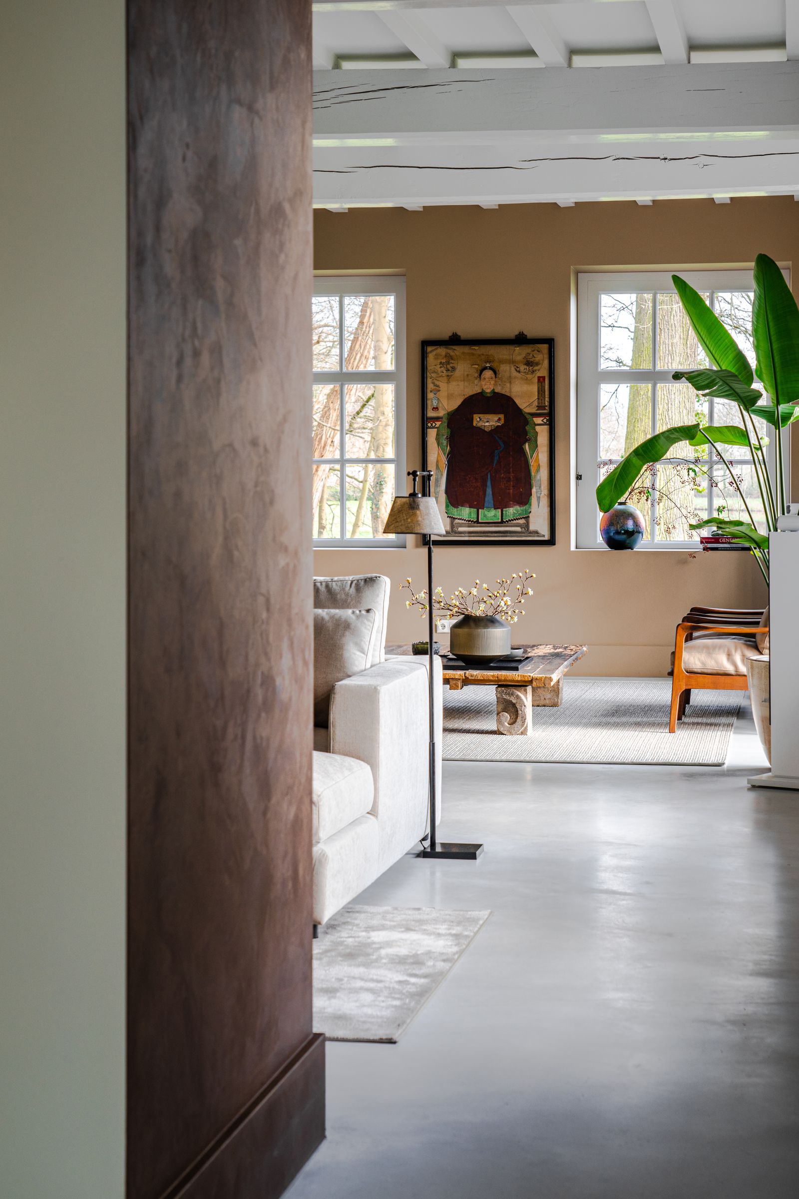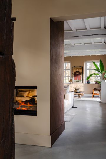 Vanuit de keuken kom je via een gang in de woonkamer terecht waarbij de schouw is geschilderd met Traditional Paint High-Gloss Elements Collection in de kleur Copper door Pure & Original dealer Mooi & Puur. De wanden zijn geschilderd met Licetto in de kleur Latte Macchiato en het plafond met Classico krijtverf in de kleur Silk White. De balken van het plafond zijn geschilderd met Traditional Paint High-Gloss in de kleur Silk White. De vloer van de verhoging in de woonkamer is geschilderd met Carazzo vloerverf in de kleur Black Truffle.