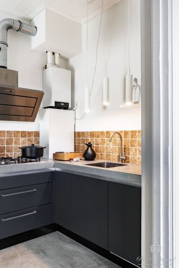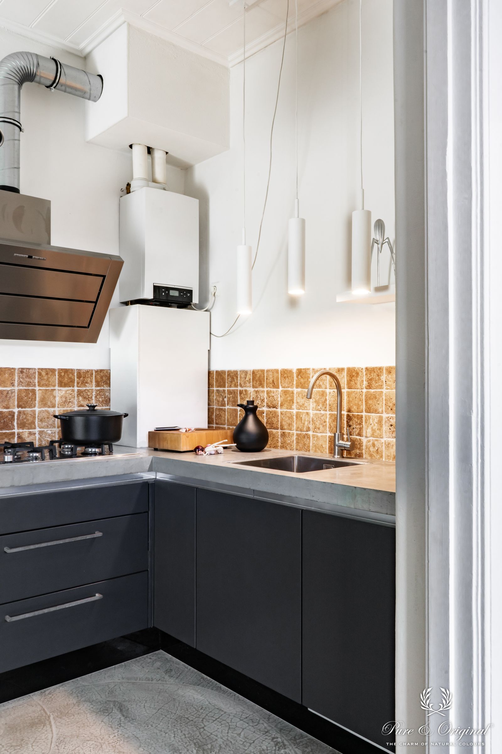 Keukenkasten zijn geschilderd met Carazzo universele lak in de kleur Slate Grey