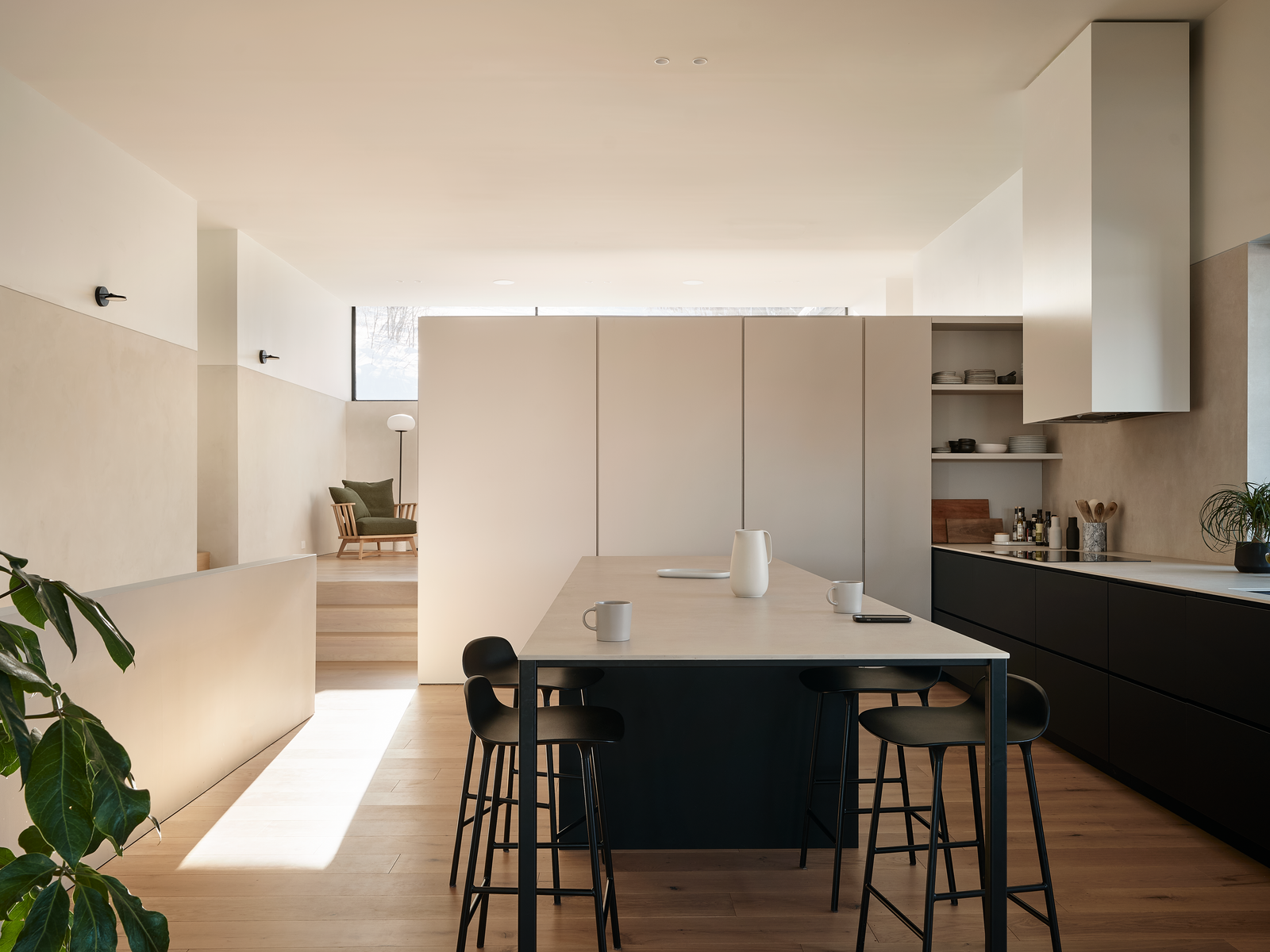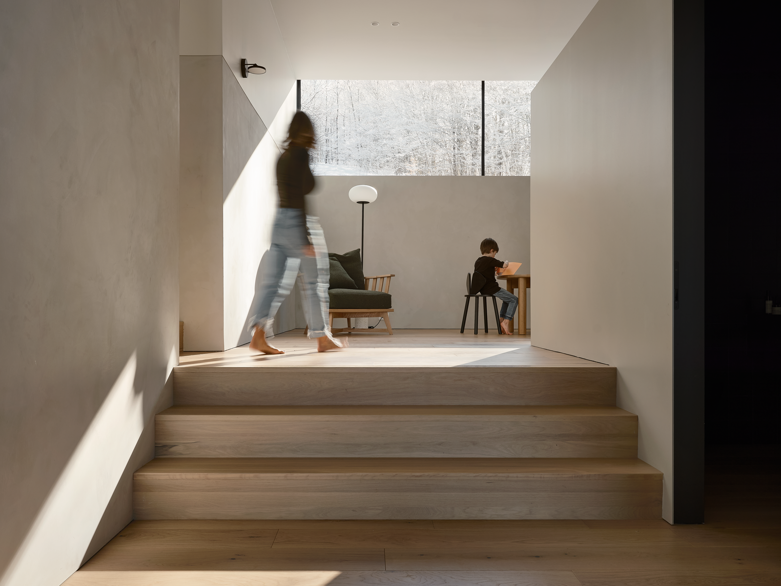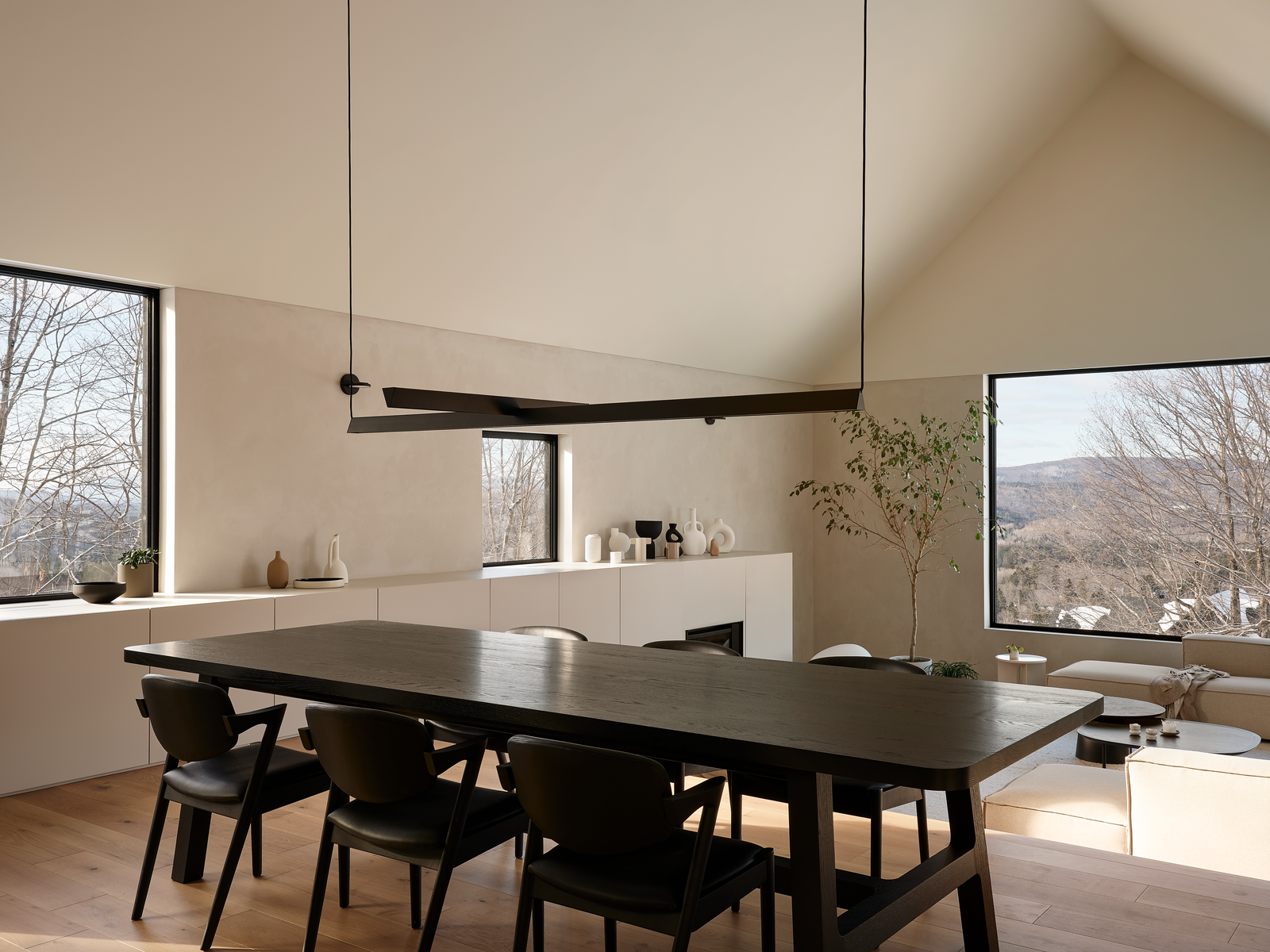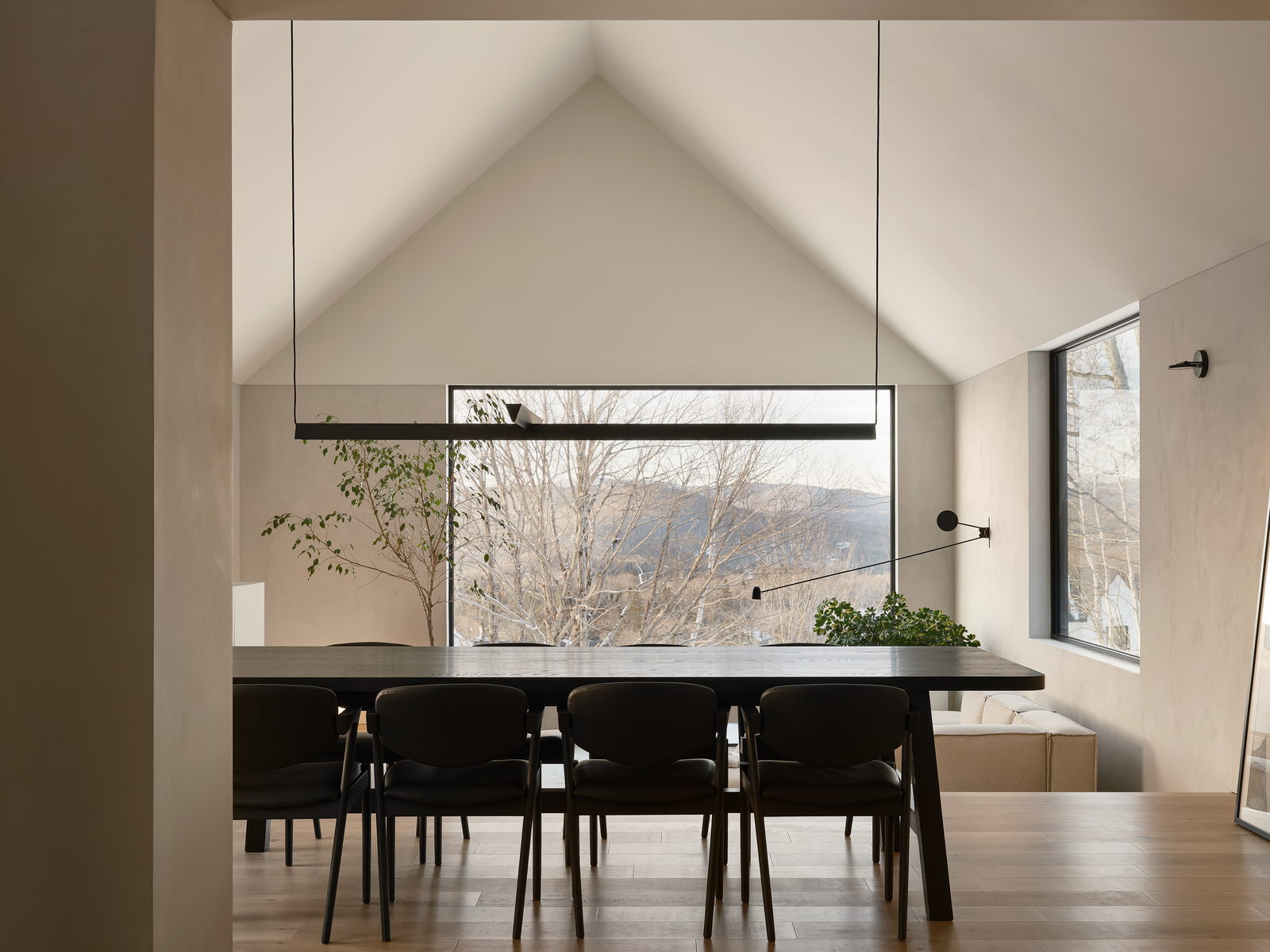Aan de skipistes van Mont-Sain-Castin in Quebec ligt deze prachtige woning. La Shed Architecture werd gevraagd om met de woning aan de slag te gaan. De wens van de eigenaren om onafhankelijke ruimtes te creëren wordt weerspiegeld in de overgangen, die de drempels tussen de verschillende gebruiksmogelijkheden van het huis benadrukken en de privé ruimtes van de leefruimtes scheiden. De minimalistische sfeer van het interieur weerspiegelt het idee van de bewoners van een rustgevende, sobere ruimte waarin de landschappen tot hun recht komen.