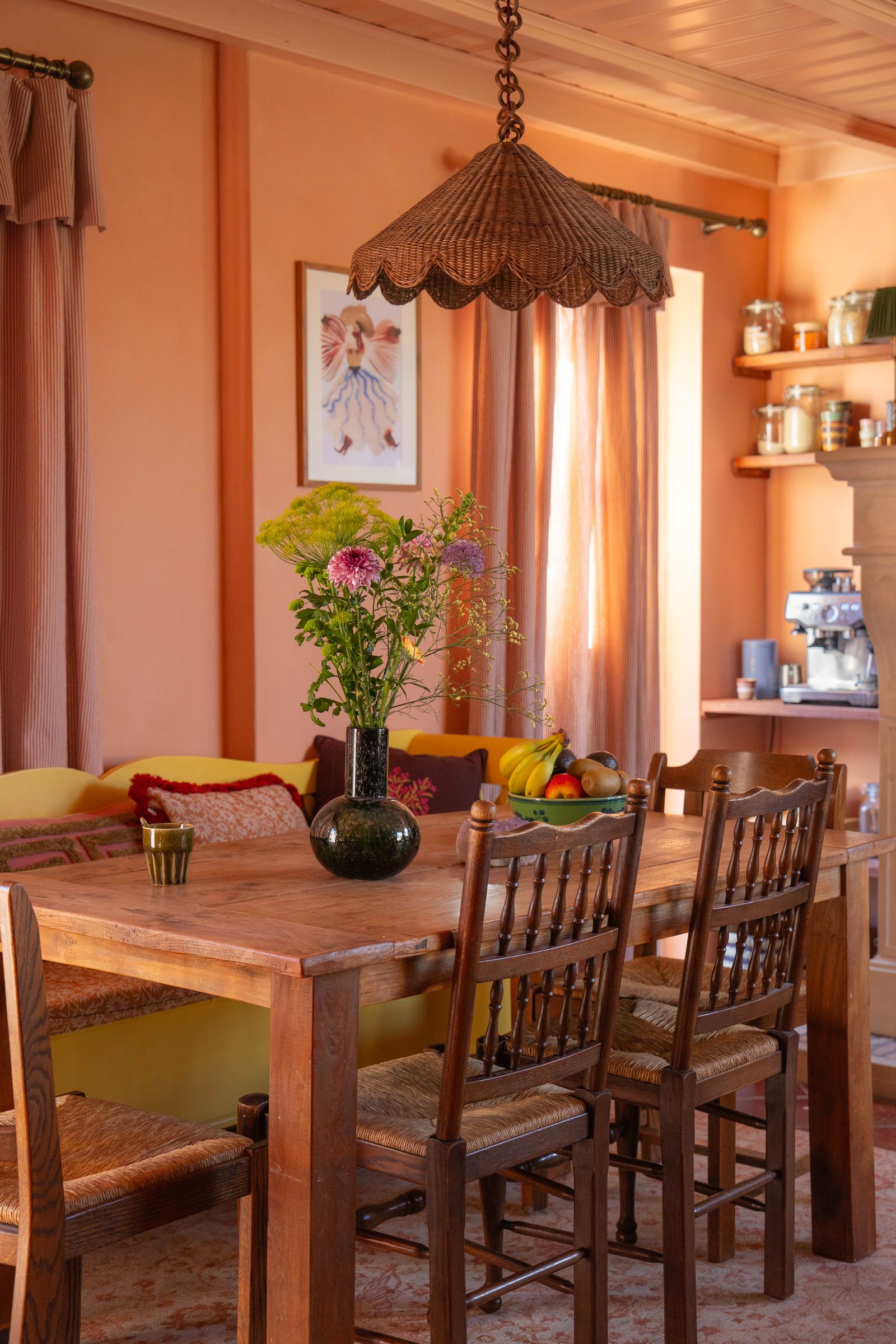 Wat deze woning zo bijzonder maakt, is de samenhang tussen de ruimtes. Juul heeft bewust dezelfde kleuren laten terugkomen in de eetkamer en woonkamer. In de eetkamer en woonkamer zorgen de roze tinten voor een warme, uitnodigende sfeer, perfect voor lange diners en gezellige momenten. In de keuken combineert zij Coy Blush met Country Green waardoor de ruimte fris en ontspannen aanvoelt. Door kleuren te herhalen maar subtiel te variëren in toepassing, ontstaat een natuurlijk flow door het hele huis.