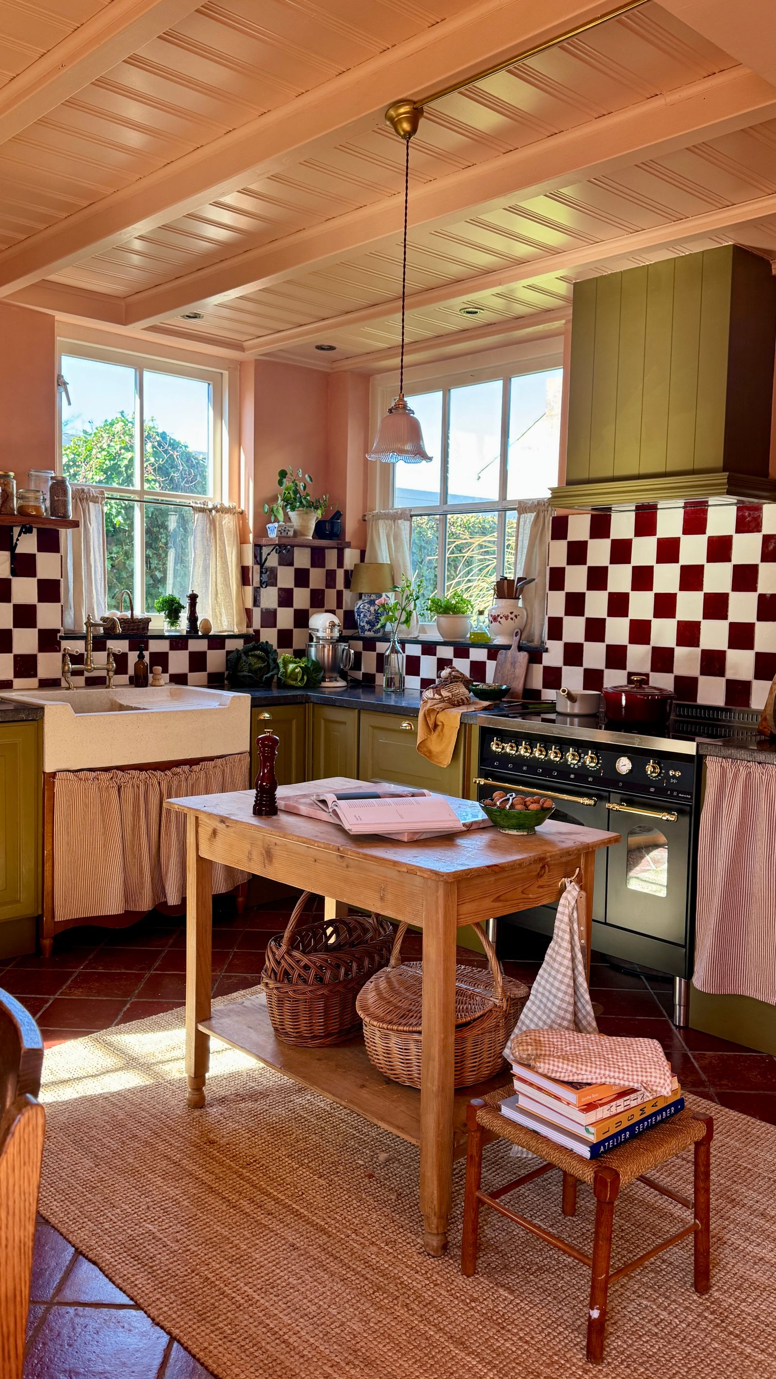 Het resultaat? Een keuken die licht vangt, warmte uitstraalt en een bijna poederachtige zachtheid heeft. De krijtverf zorgt bovendien voor een subtiele, levendige textuur die perfect past bij de landelijke en authentieke uitstraling van de ruimte. De combinatie met de rood-witte tegels en natuurlijke materialen zoals hout en keramiek maakt het geheel speels én elegant.