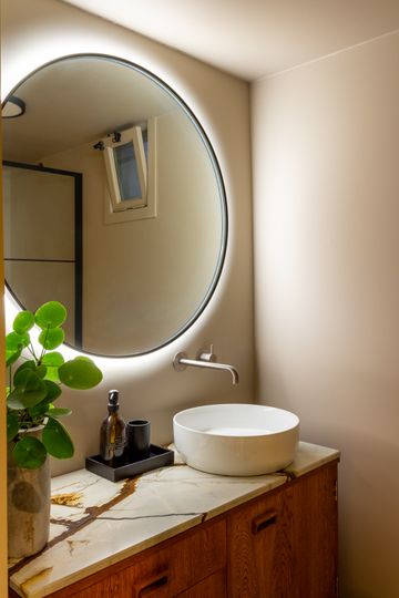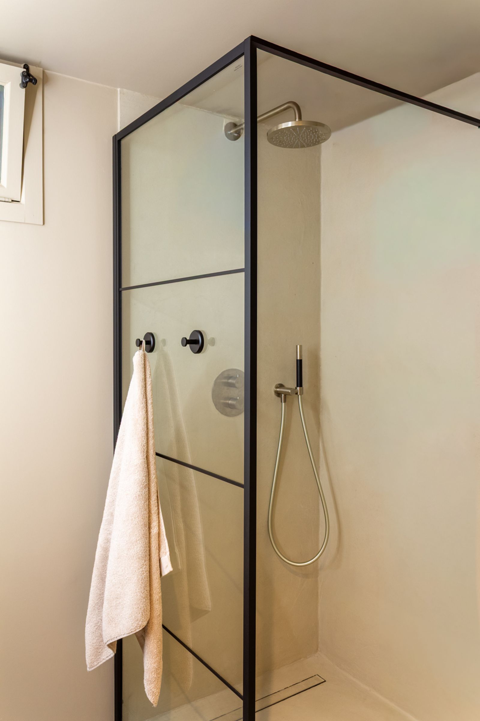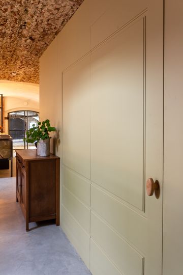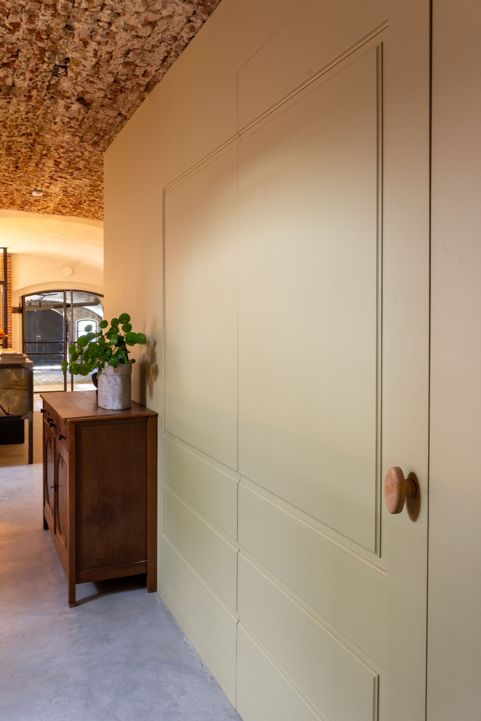 In het appartement zijn zachte, natuurlijke tinten toegepast die perfect aansluiten bij de unieke architectonische elementen van de grachtenkelder. De matte kalkverf in de kleuren Castile Foam en White Orchid zorgt voor een serene, warme basis die prachtig meebeweegt met het natuurlijke licht. Voor de ruimtes waar duurzaamheid en onderhoudsgemak essentieel zijn, is gekozen voor Licetto afwasbare muurverf in de tinten Castile Foam, Silver Clay en North Sea Silt. De badkamer is afgewerkt met de robuuste en waterbestendige stucco verf Massif in de kleur North Sea Silt, wat een luxe en rustgevende spa‑sfeer creëert.