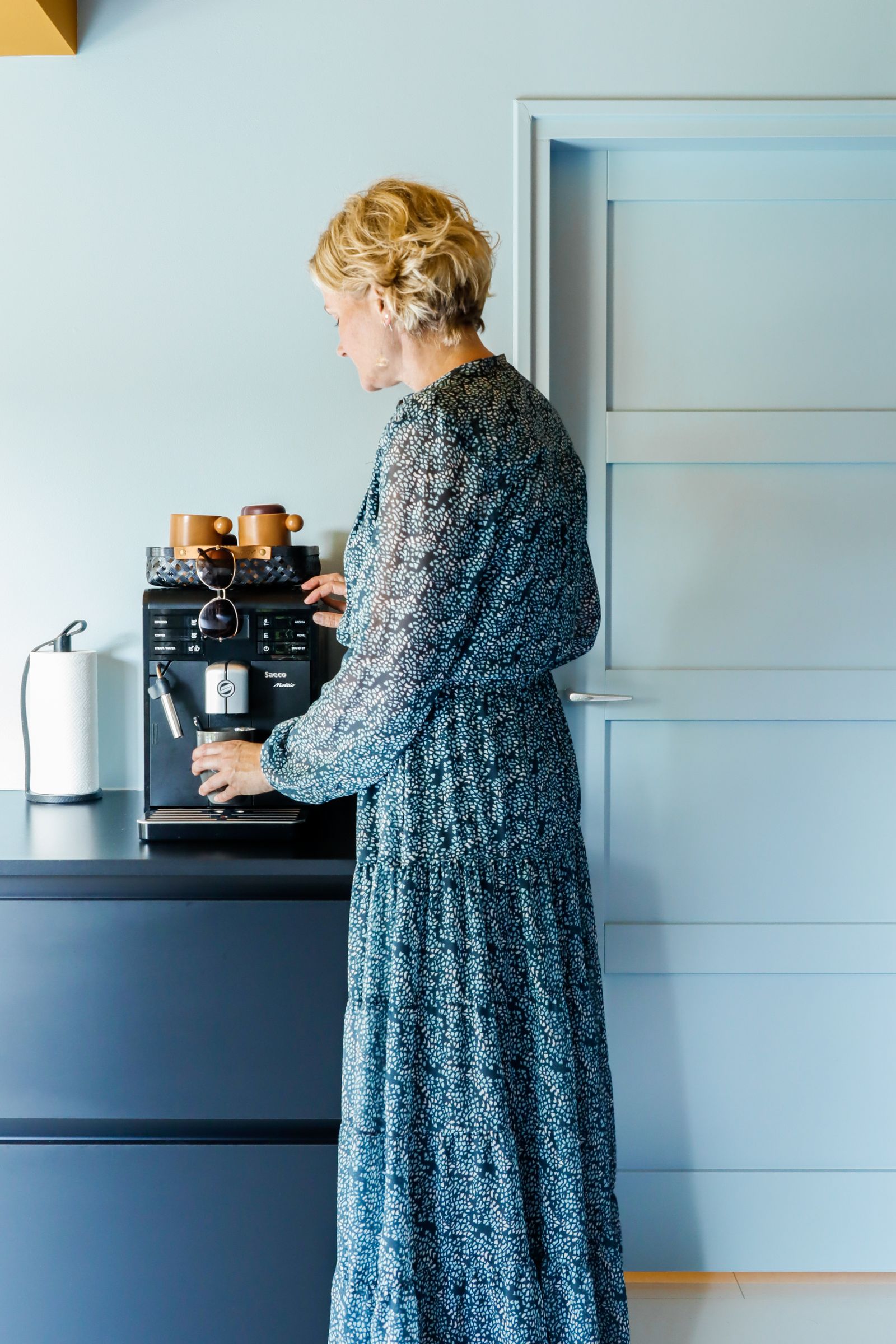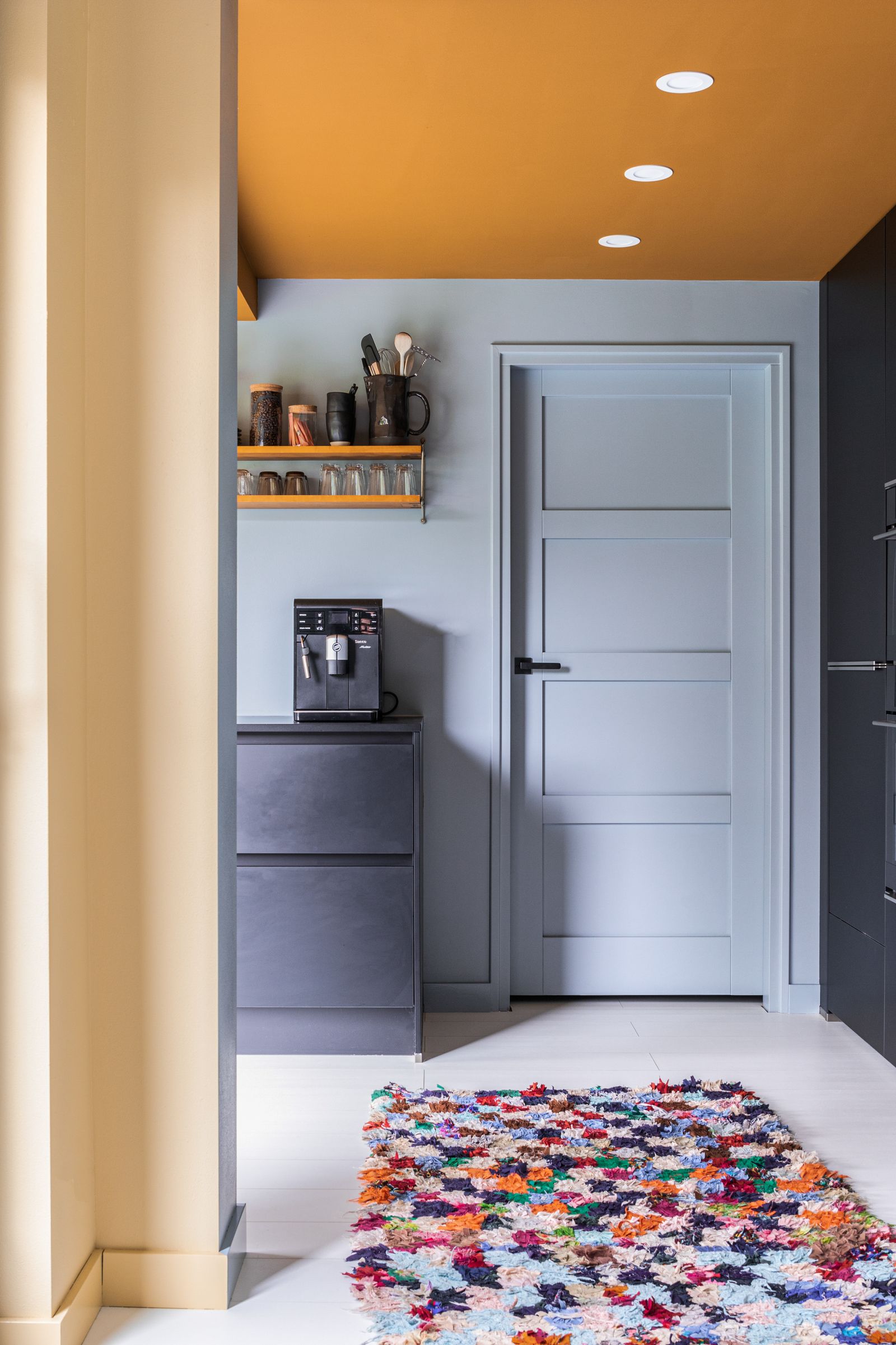 De meeste mensen kiezen voor witte plinten en deuren. Persoonlijk verf ik ze graag mee met de kleur op de muur. Dit geeft een rustig beeld en creëert eenheid in het grote geheel. In onze keuken gebruikte ik op de deur en het deurkozijn Traditional Paint Eggshell lakverf. Een slijtvaste effen en waterafstotende lak met zijdeglans finish. De deur gaat hierdoor bijna helemaal op in de muur.