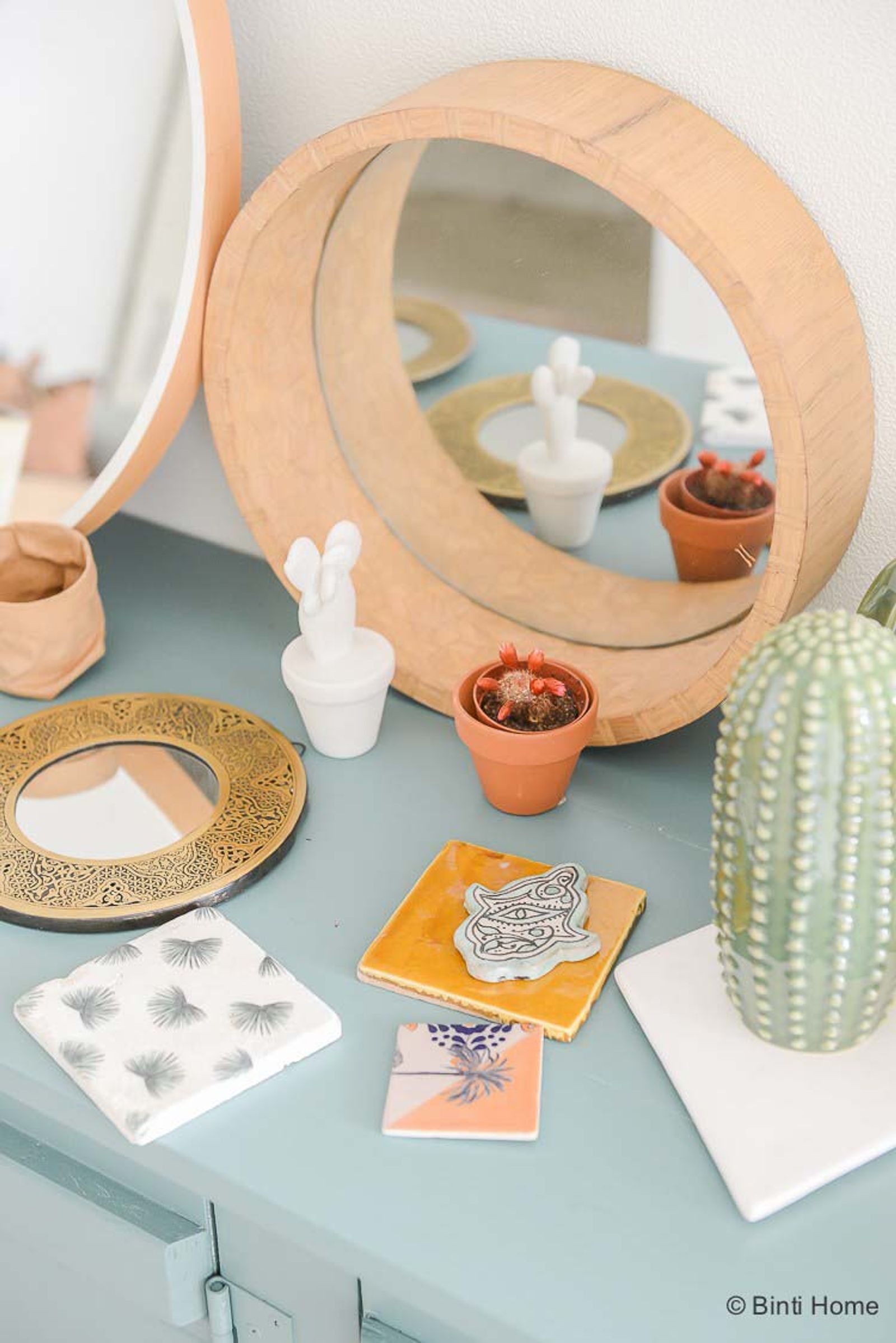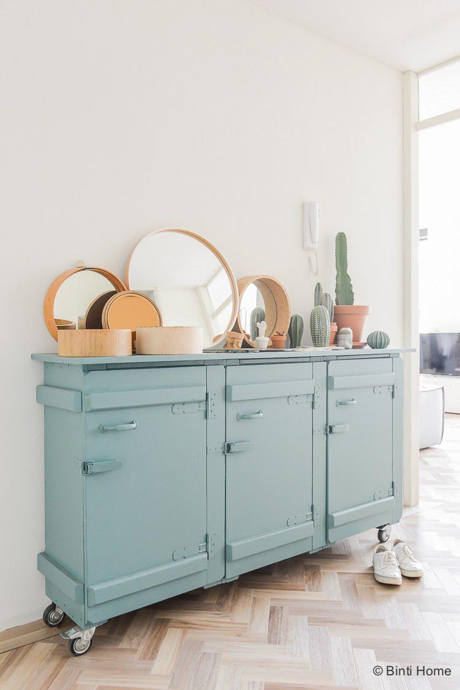 Na wikken en wegen kreeg de kast een mooi plaatsje in de hal. Weer eens wat anders dan in de woonkamer of keuken! Deze keer een ware eye-catcher bij binnenkomst. Ronde spiegels en verschillende cacti kregen een mooie plek op de kast. Een persoonlijke mini expositie, welke direct persoonlijkheid toevoegt aan de ruimte.