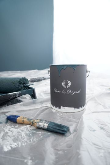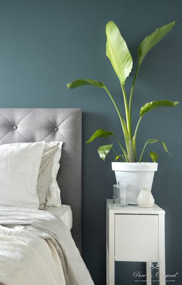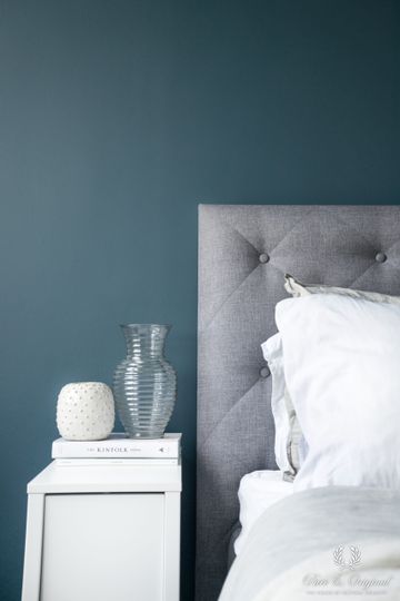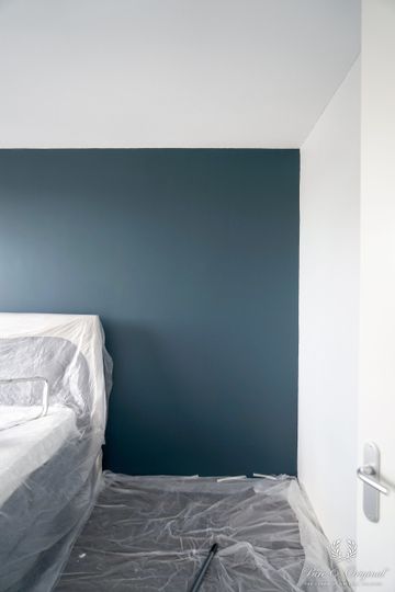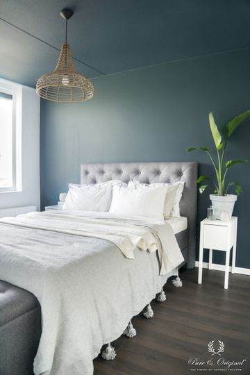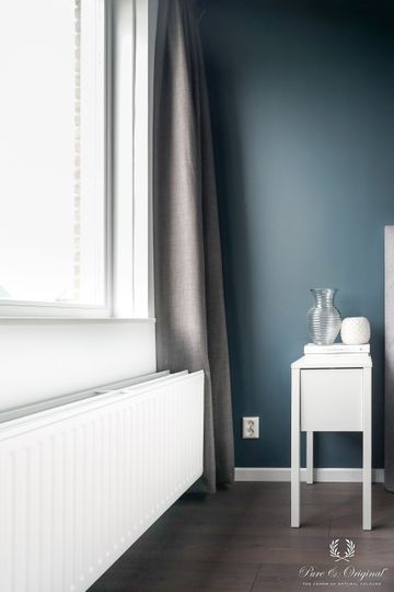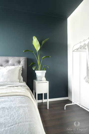 De slaapkamer opnieuw schilderen stond dan ook hoog op ons wensenlijstje, en al snel zag ik op Pinterest een voorbeeld voorbijkomen van een diepe, donkerblauwe, bijna zwarte kleur. Ik was op slag verliefd! Het was een vereiste dat de verf die we zouden gebruiken op natuurlijke basis zou zijn, dan hoefden we niet te verhuizen met ons bed en konden we gewoon blijven slapen in dezelfde kamer. Na een zoektocht op internet kwamen we uit op de kleur Steel Blue (Licetto) van Pure & Original. De prachtige, donkere diepblauwe kleur op natuurlijke basis, dus zonder chemische geur!