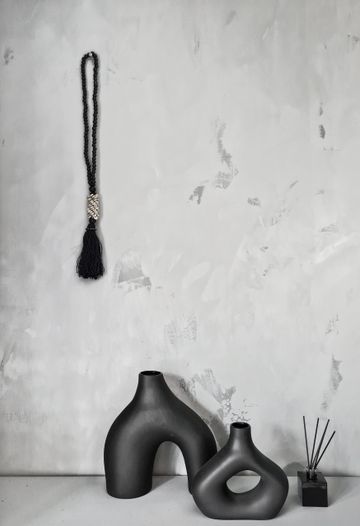 Nu de verf gedroogd is, kunnen we aan de slag met het inrichten en stylen van de slaapkamer. Ideaal hiervoor is een hoofdbord. Wij hebben er zelf 1 gemaakt en zo’n hoofdboard heeft als voordeel dat je je muur beschermt, je kan er tegenaan zitten met een paar kussens in je rug en je kan deze gebruiken om wat mooie woonaccessoires neer te zetten. Ik werk zelf graag met contrast in huis dus nu we een lichtgrijze muur hebben gemaakt, kies ik voor donkere woonaccessoires en om wat warmte toe te voegen een aantal beige tinten.