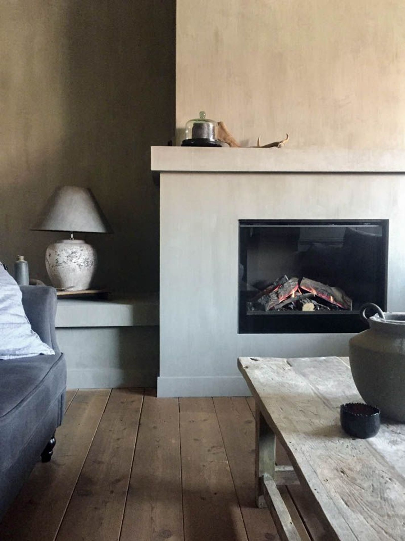 Voor op de wanden is gekozen voor een combinatie van twee verschillende kleuren Fresco kalkverf. De wanden van de haard en bij de divan zijn geschilderd in de grijsbruine kleur Dried Clay. De overige wanden hebben de zachtgrijze kleur Old Flax. Op de deuren zit een kleur die vergelijkbaar is met Black Smoke.