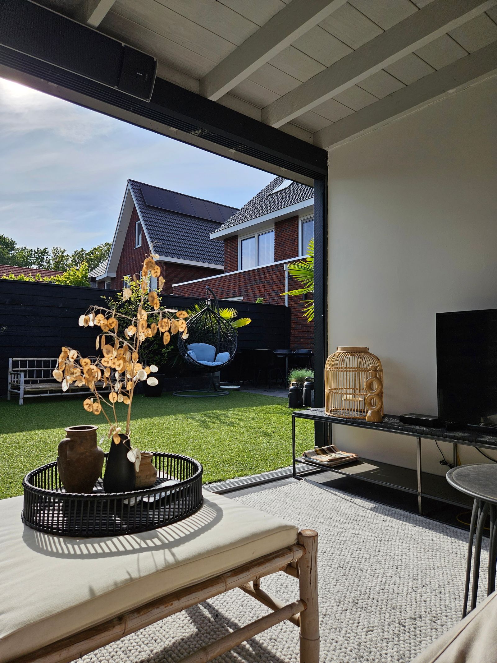 When we moved in, we built a large porch measuring 7x3 metres and two years ago we divided it into a part that we can close off with a sliding glass wall and an open part.