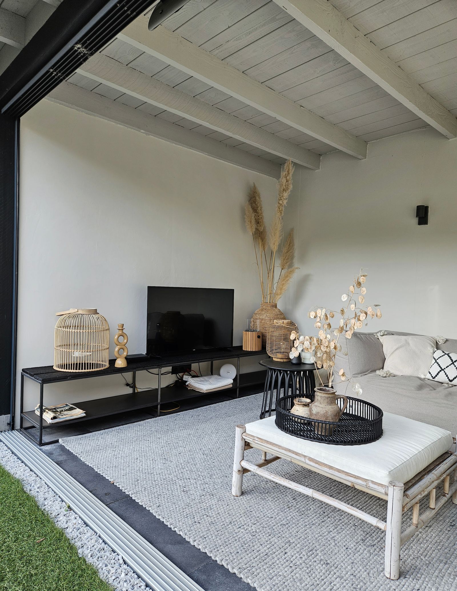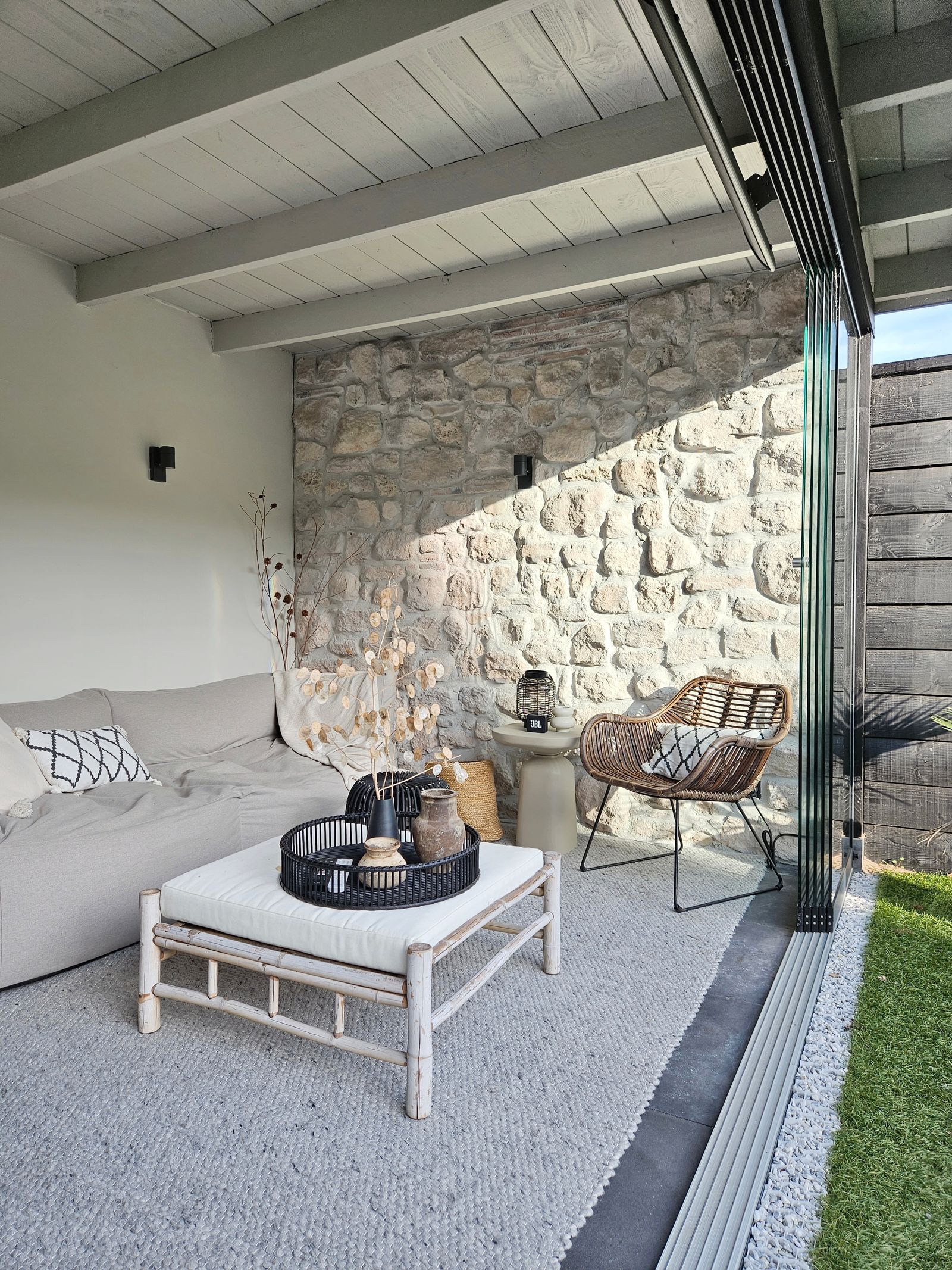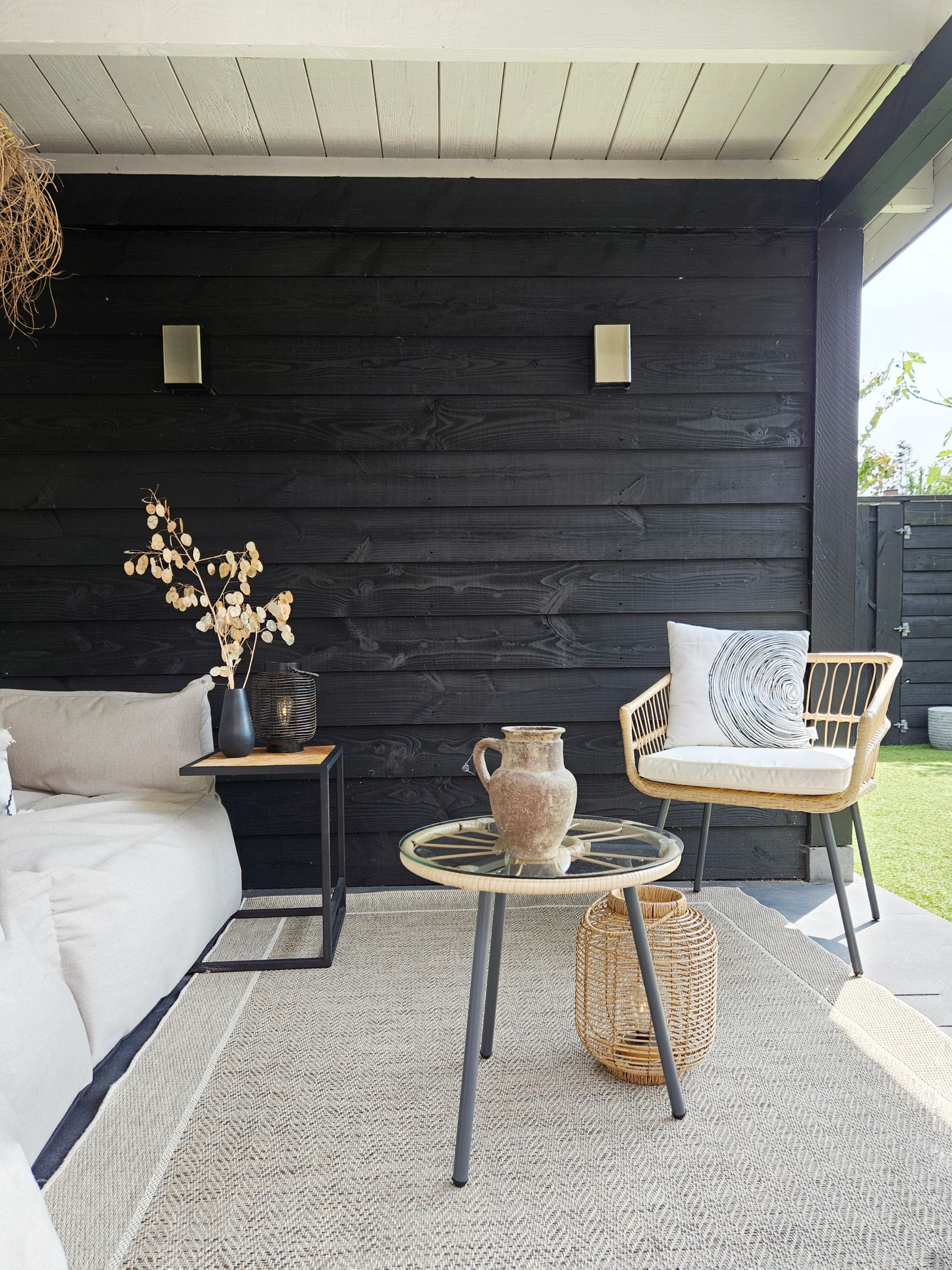 I also painted the light wall in the open part of the veranda to create unity in both areas. Here we did not put cement fibre boards against the woodwork, so here we used paint that is suitable for wood (and metal).