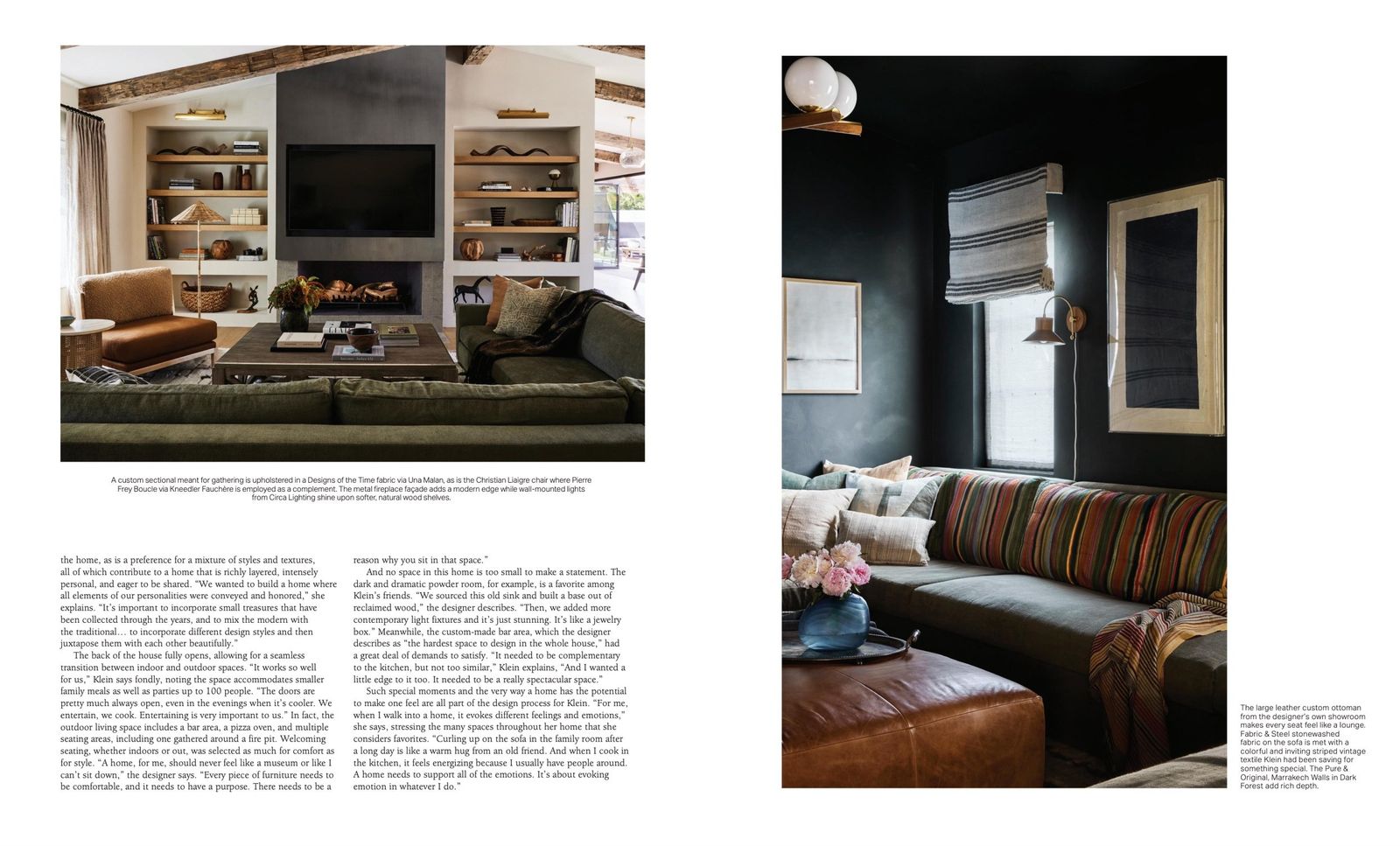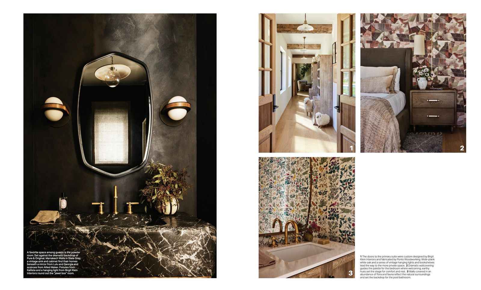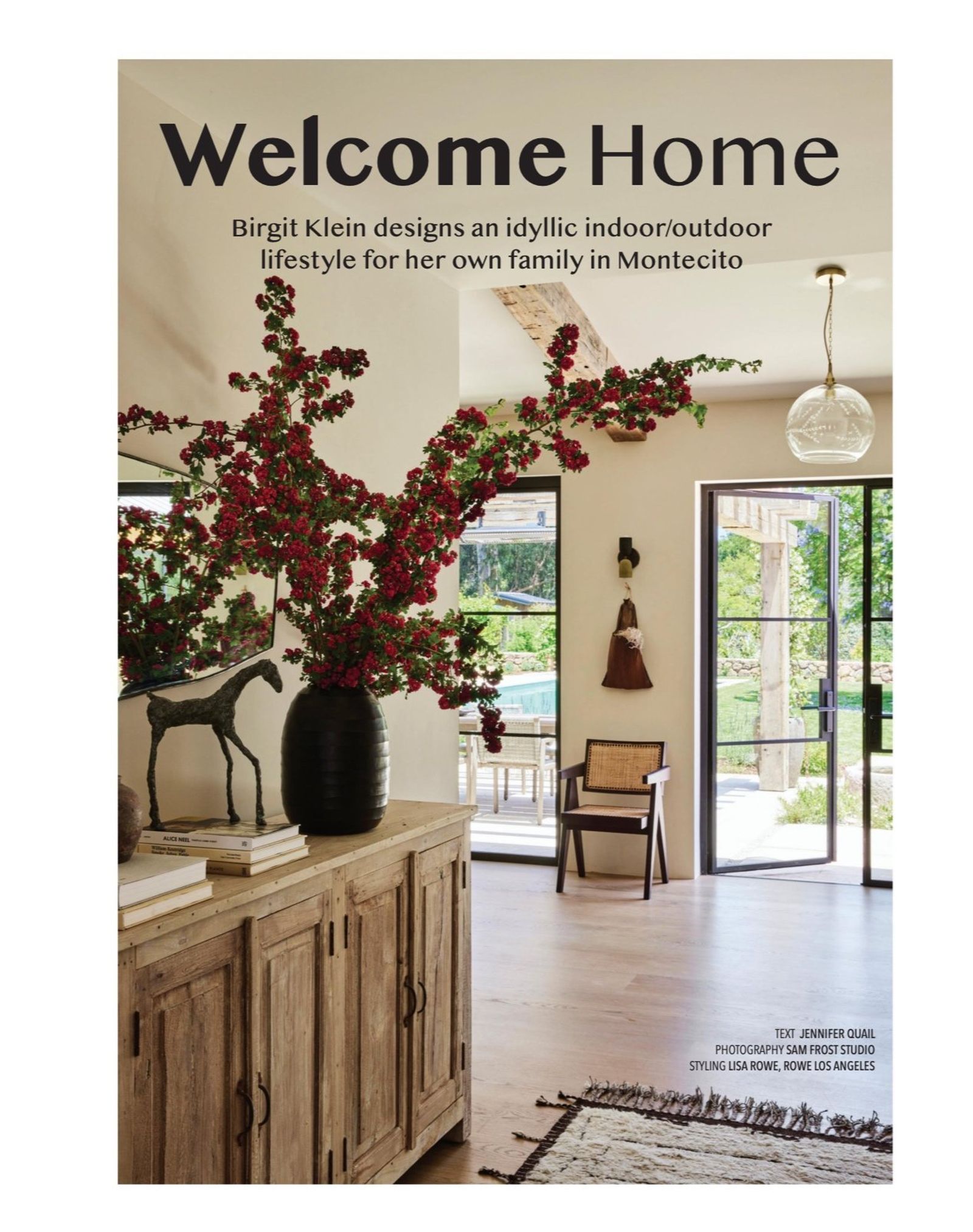 The article is about a project of Birgit Klein. She designed an indoor/outdoor idyllic interior for her own family in Montecito and used Pure & Original Marrakech Walls in Dark Forest and Slate Grey.