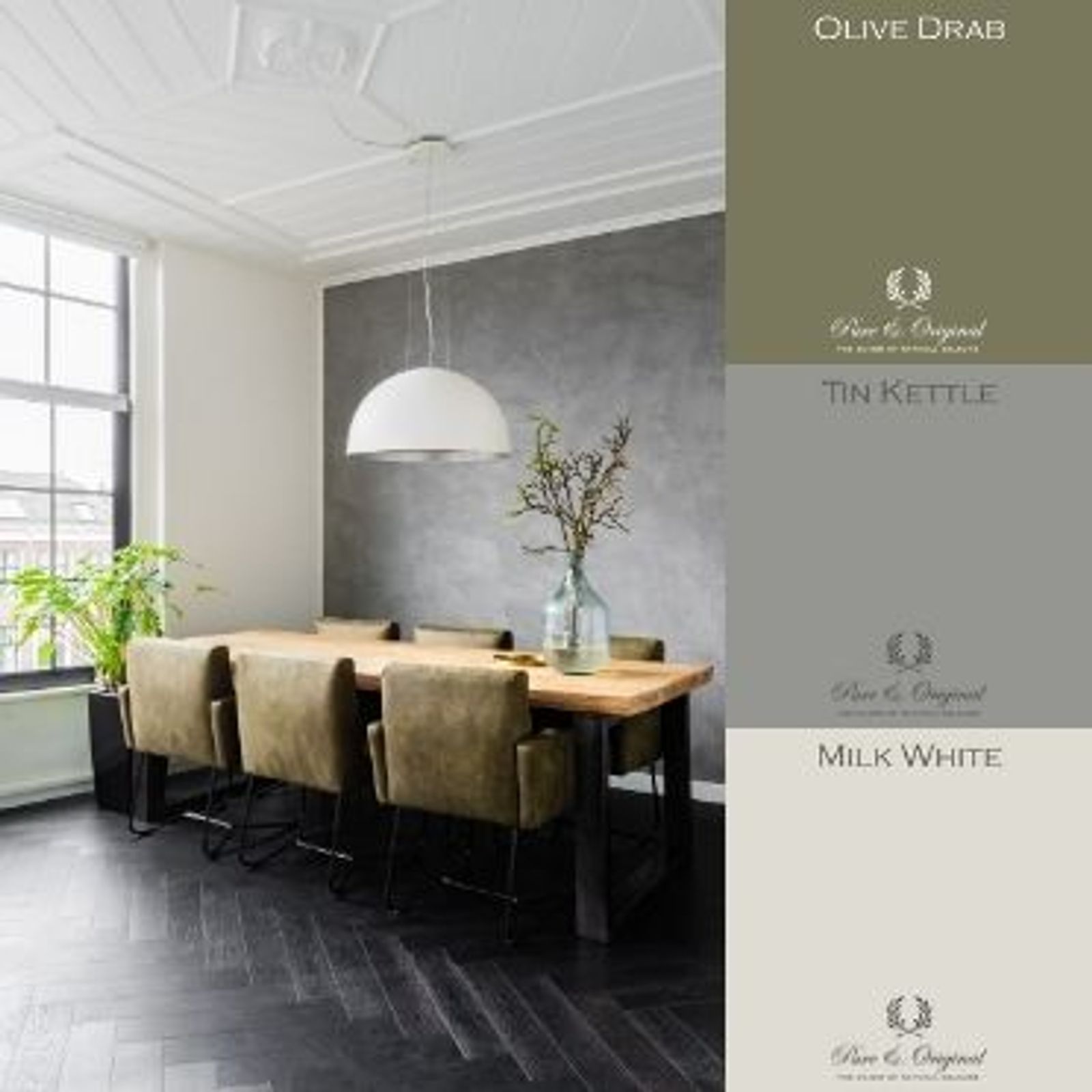 Dining room/dining area with grey Marrakech Walls concrete look wall, white ceilings and walls and black wooden floor with olive green dining room chairs