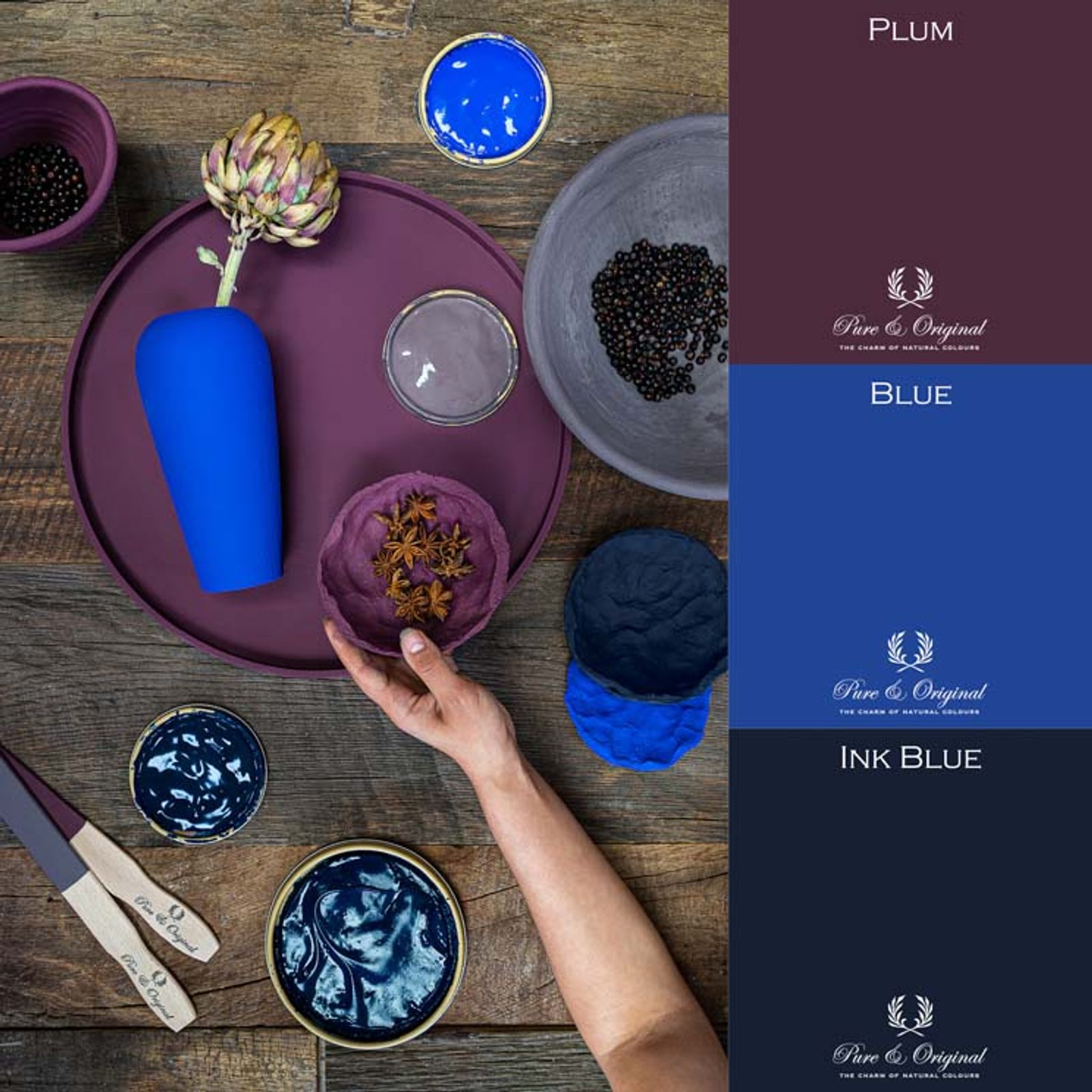 Interior accessories and paint in different tones of blue, grey and purple
