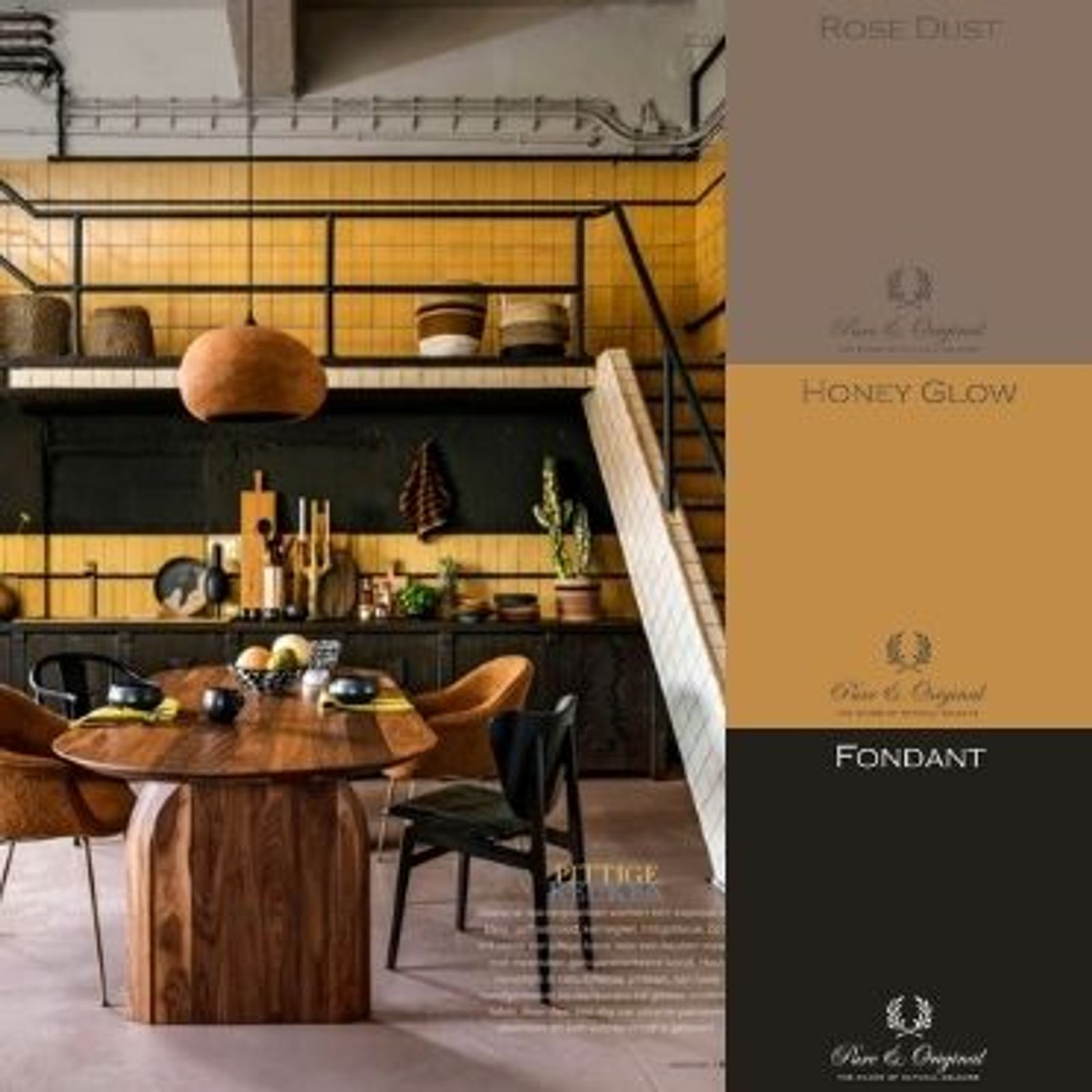 Kitchen dark brown in the colour Fondant with yellow tiles and wooden accents and furniture