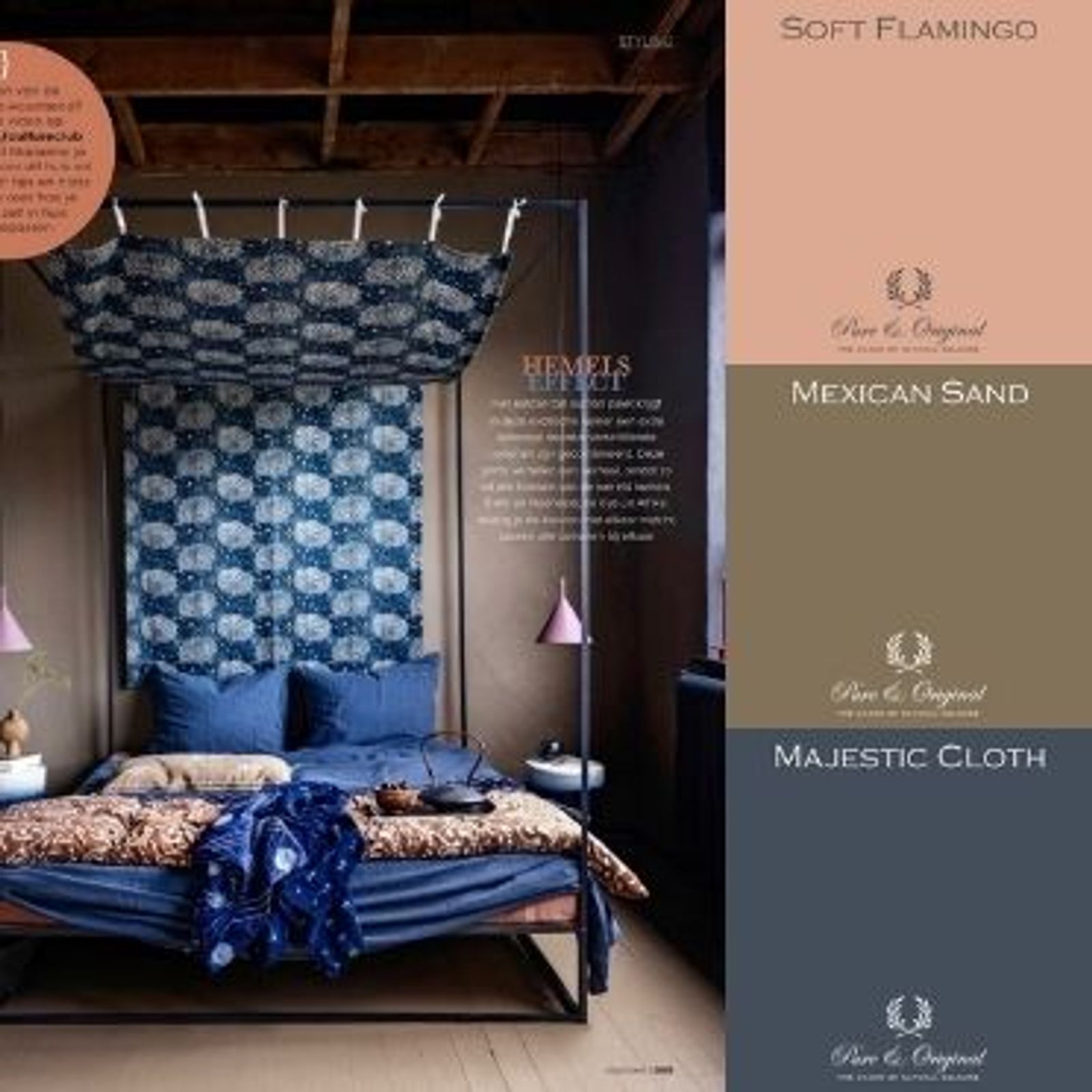 Bedroom with Mexican Sand on the walls, blue bedding and pink accents