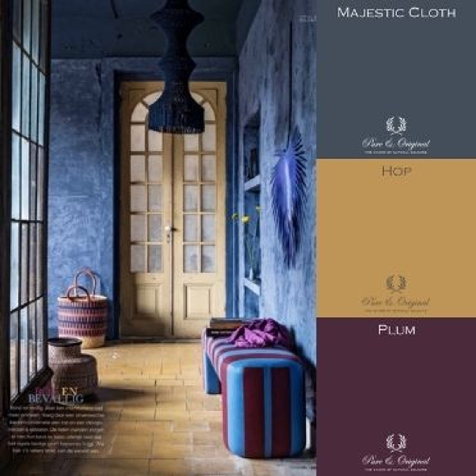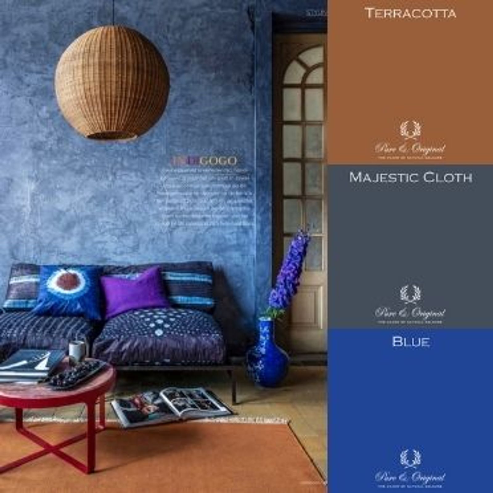 Living room with blue sofa, blue wall in Marrakech Walls Majestic Cloth and terracotta and purple accents