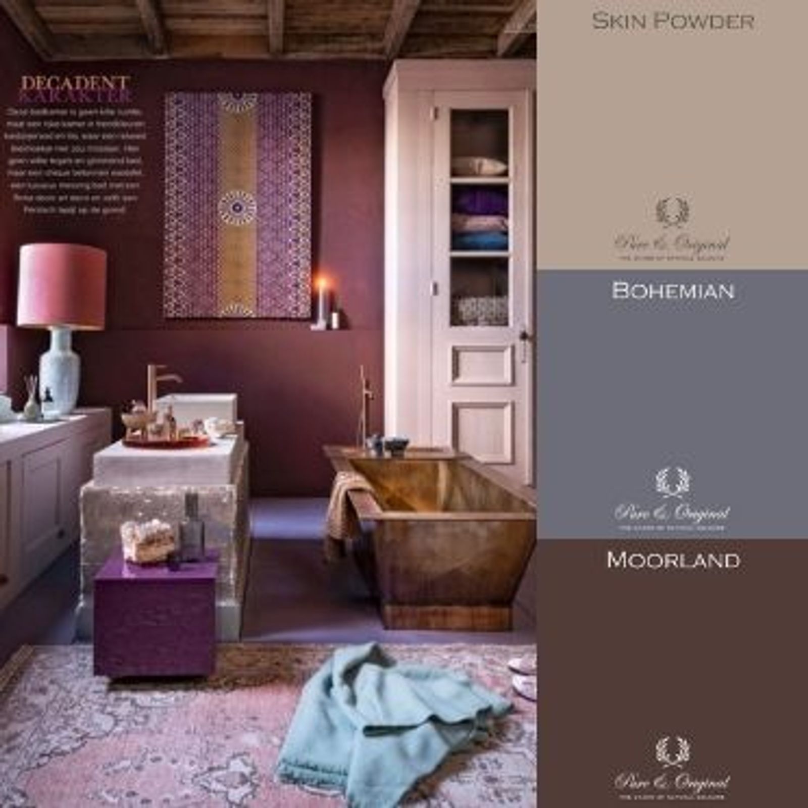 Purple bathroom with pink furniture and copper tub