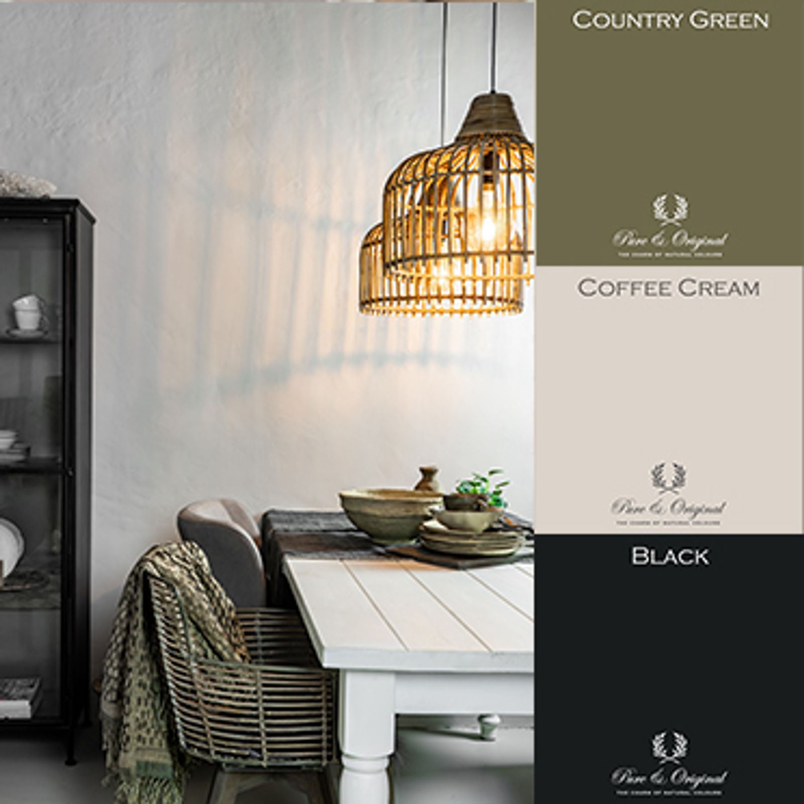Dining area / dining room with white wooden table, beige walls Coffee Cream, black cabinet Black and green accents Country Green