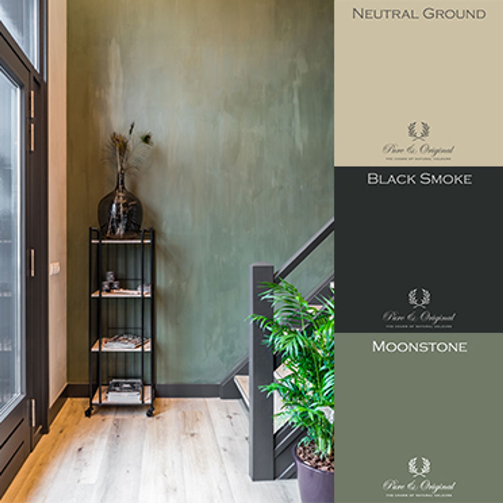 Hallway with green wall Fresco lime paint and painted black stairs in Carazzo and black window frames with wooden floor