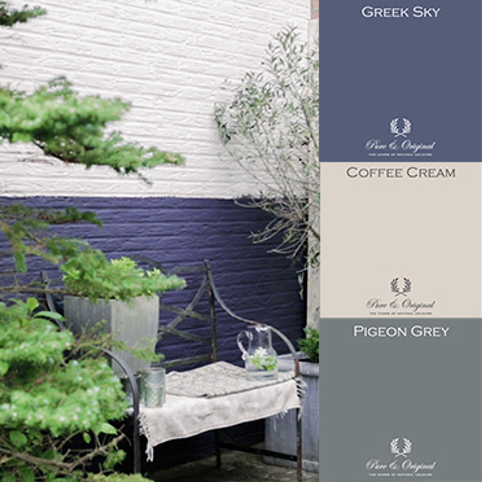 Exterior wall with white wall paint, blue wall paint, and green accents Greek Sky, Coffee Cream, Pigeon Grey