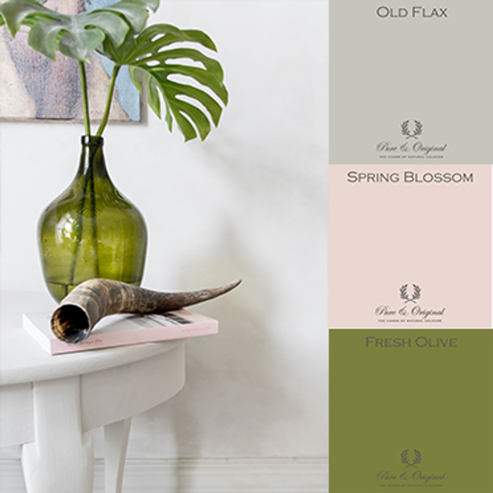 White table, white walls, green vase and pink accents, Old Flax, Spring Blossom, Fresh Olive