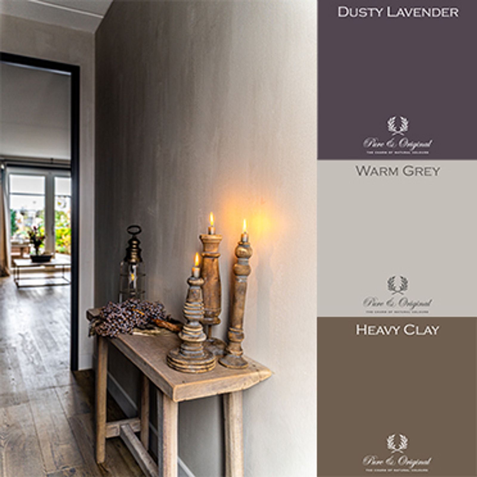 Corridor with gray wall, rural wooden accents and wooden floor Dusty Lavender, Warm Gray and Heavy Clay