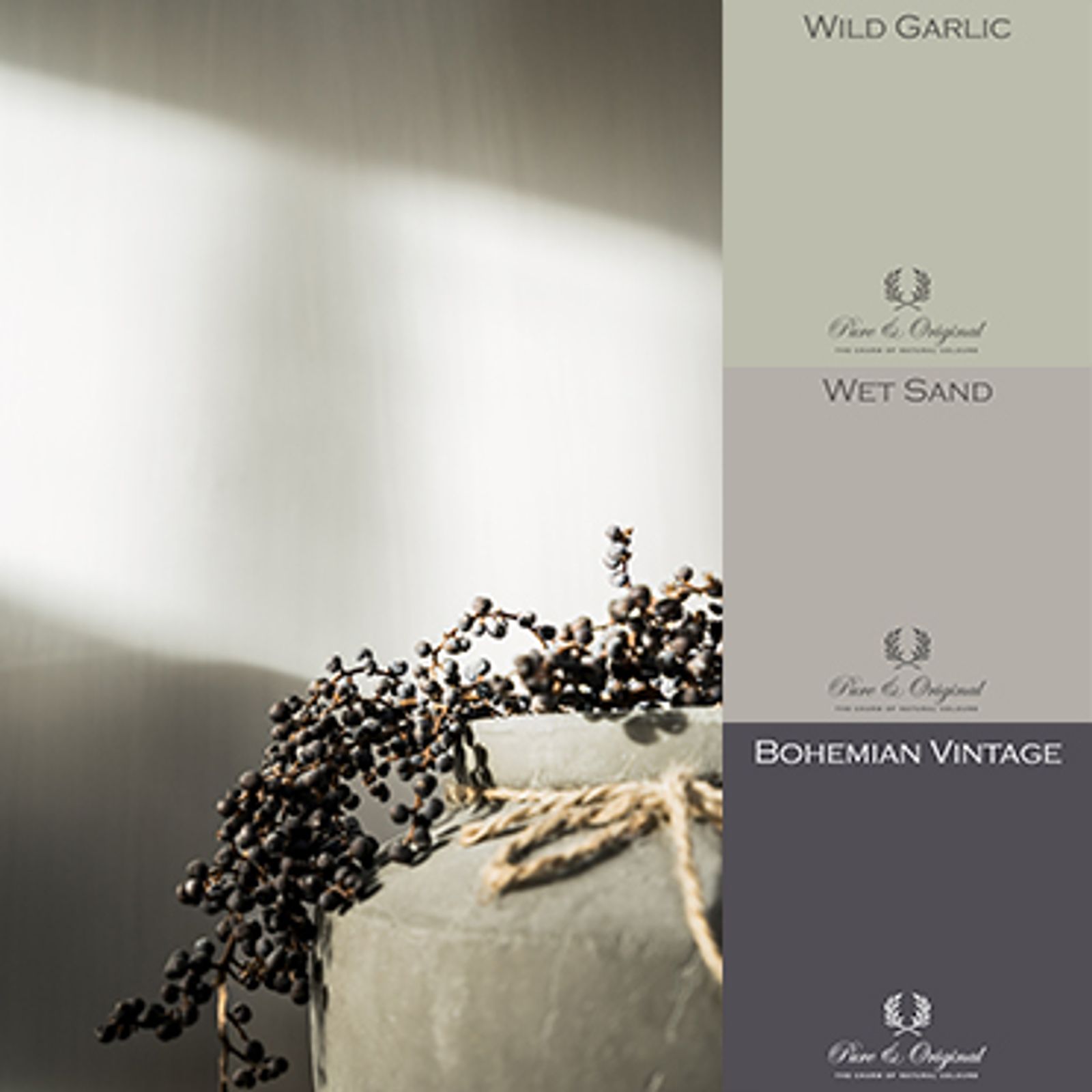 Beige gray wall with a rural pot in front of it Wild Garlic, Wet Sand, Bohemian Vintage rural living style