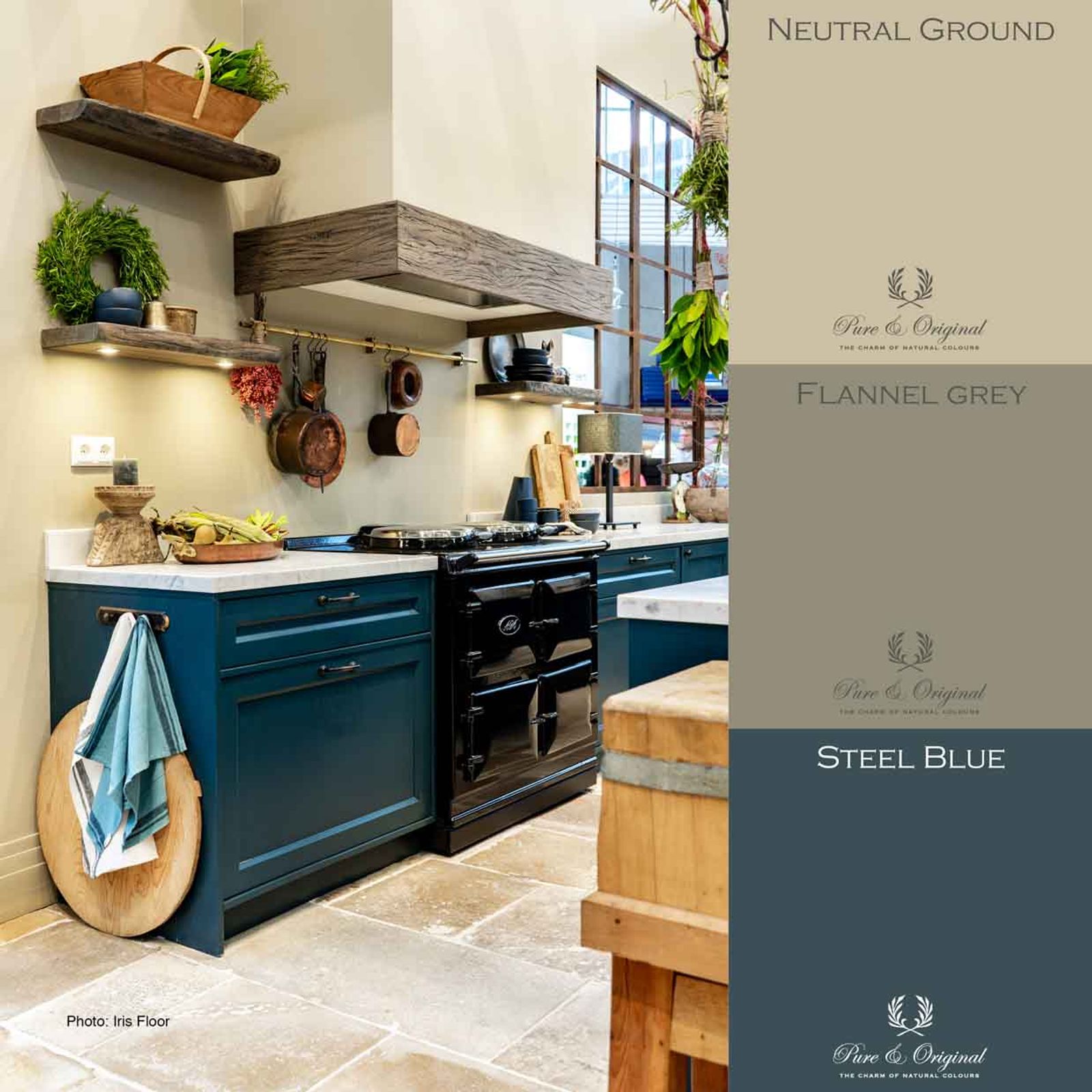 Rural cool blue kitchen with beige walls