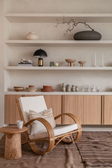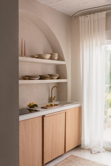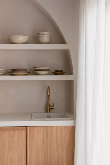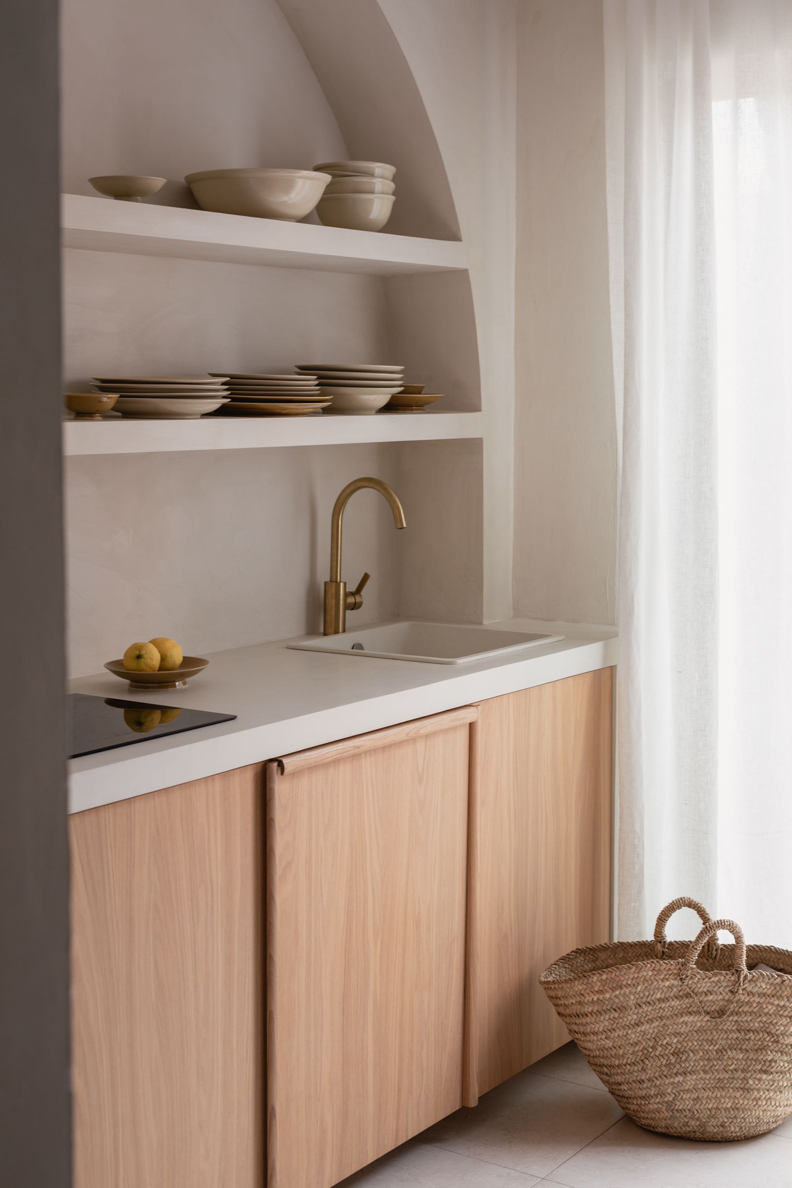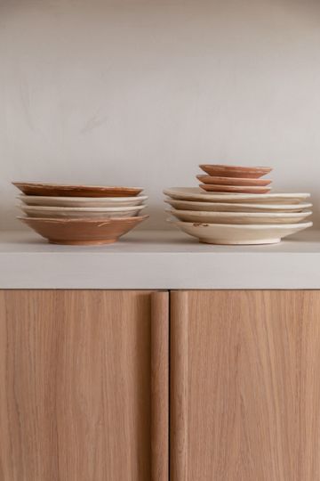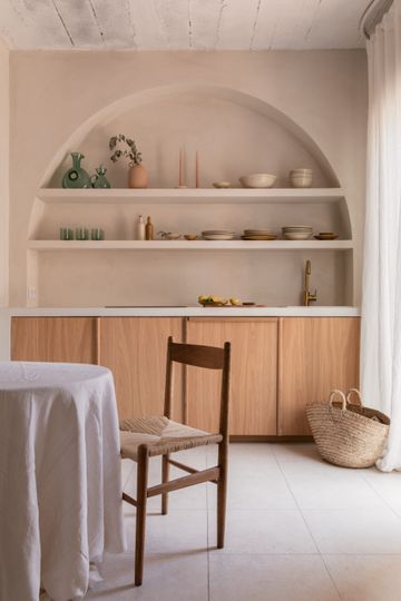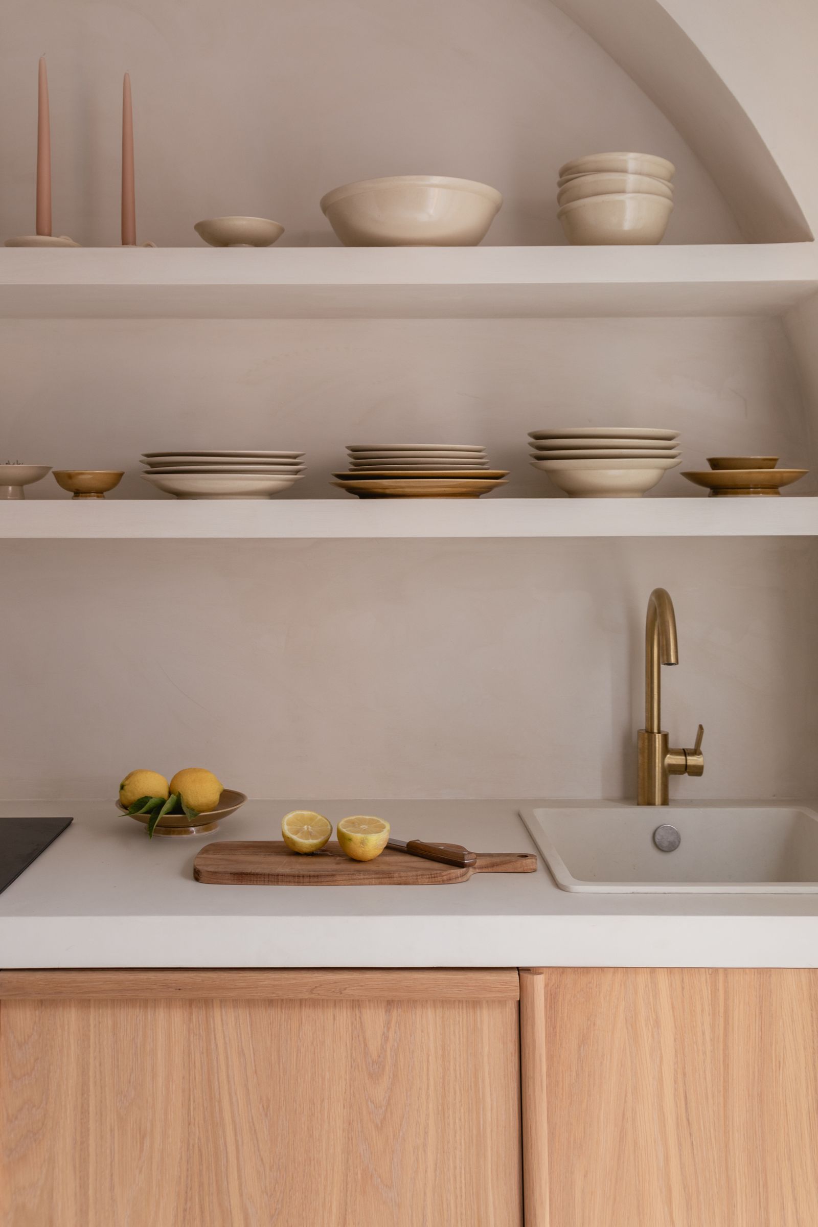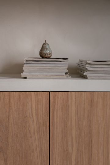 En la cocina, la pintura se protegió con Dead Flat Eco Sealer, un acabado transparente y mate. Esta capa protectora hace que la cal sea resistente a la humedad y a la suciedad, conservando al mismo tiempo toda la belleza auténtica de la superficie.