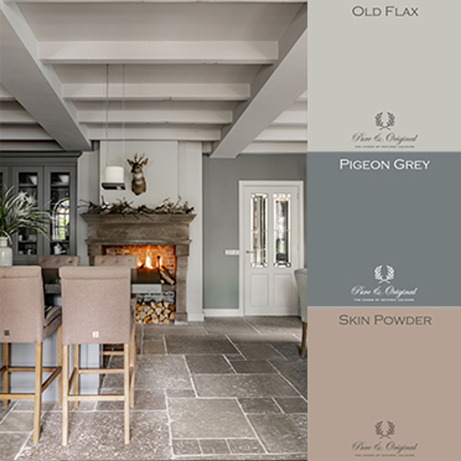 Séjour cuisine avec cuisine grise, murs gris, plafond gris, plafond blanc, bar, chaises de bar roses champêtres, sol en pierre, Vieux Lin, Gris Pigeon, Peau Poudre