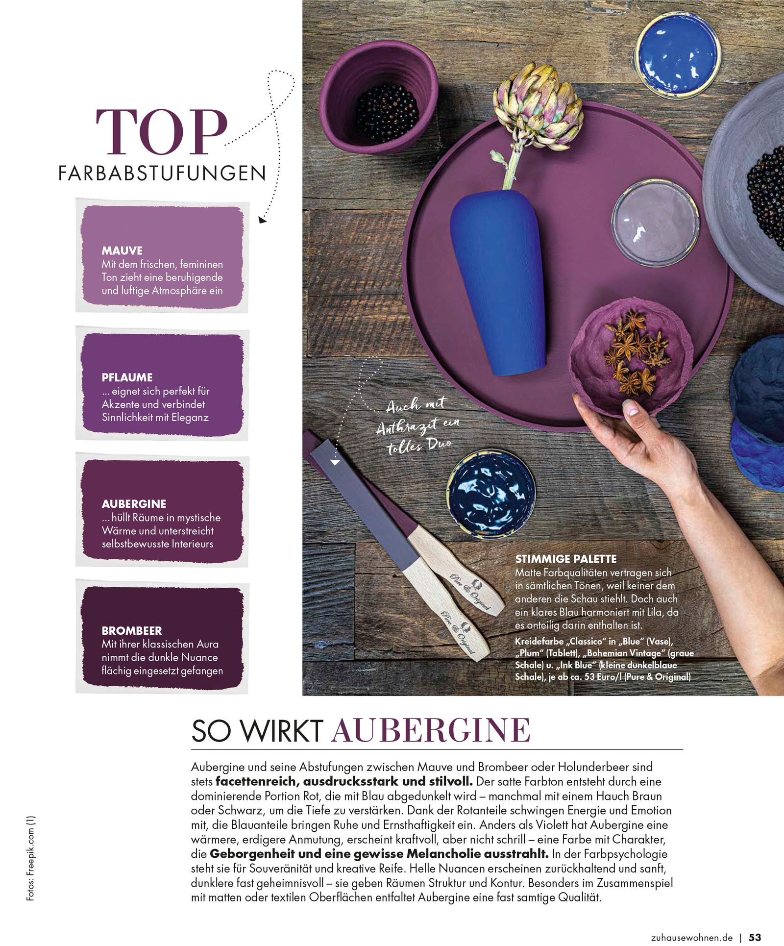 Pure & Original wordt in deze editie genoemd in een kleurenspecial met de focus op Aubergine tinten. De kleuren Plum, Blue, Bohemian Vintage, Ink Blue en Steel Blue van Pure & Original worden uitgelicht.